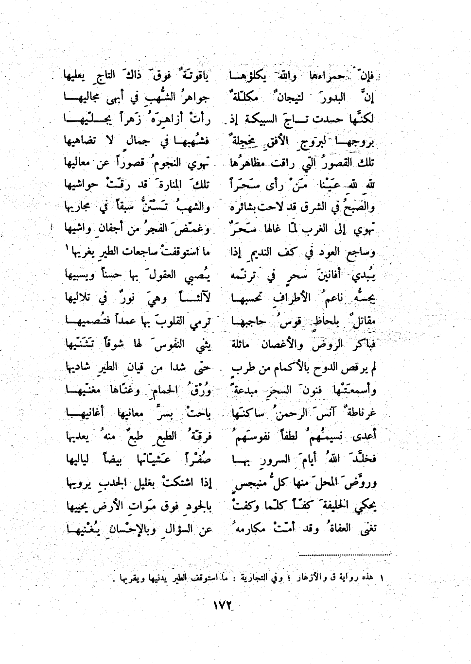 (1) هذه رواية ق والأزهار؛ وفي التجارية: ما استوقف الطير يدنيها ويقريها.