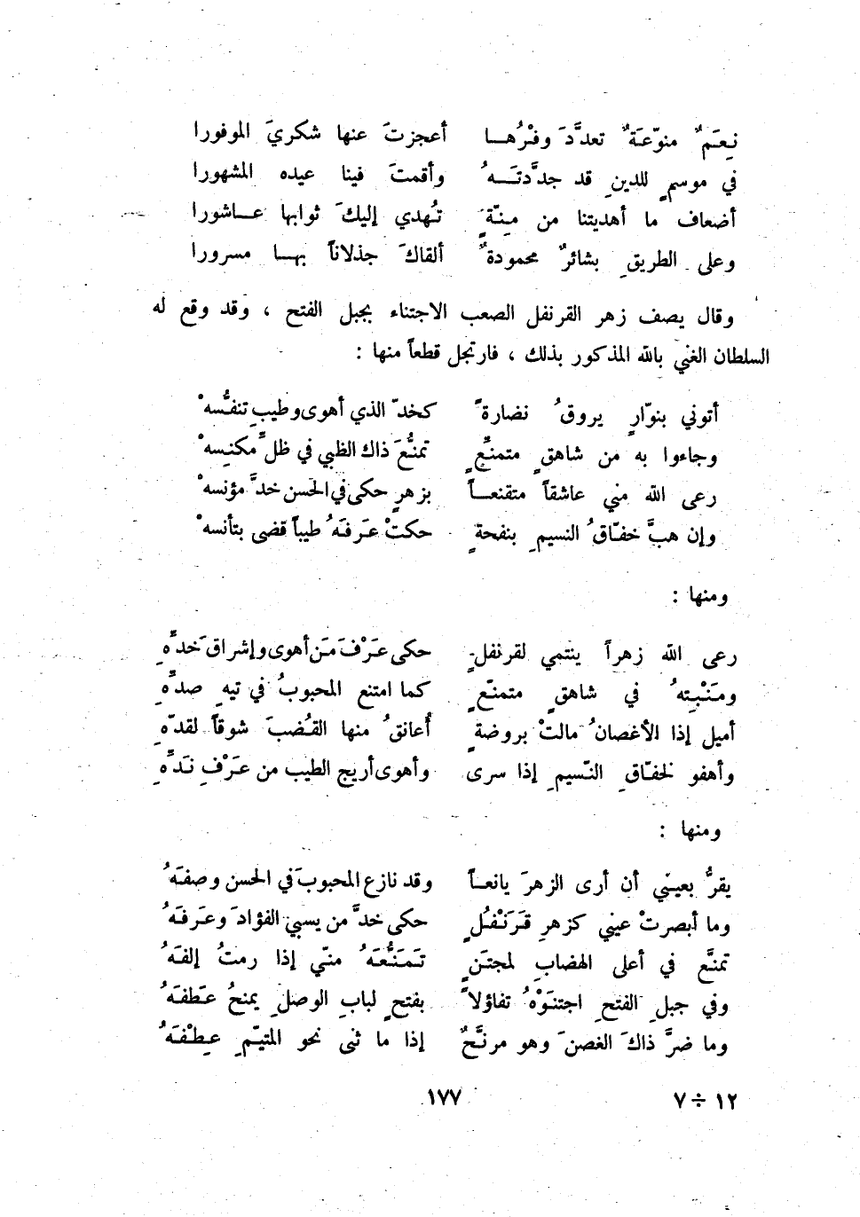 وعلى الطريق بشائر محمودة ... ألقاك جذلاناً بها مسرورا وقال يصف زهر القرنفل الصعب الاجتناء بجبل الفتح، وقد وقع له السلطان الغني بالله المذكور بذلك، فارتجل قطعاً منها: