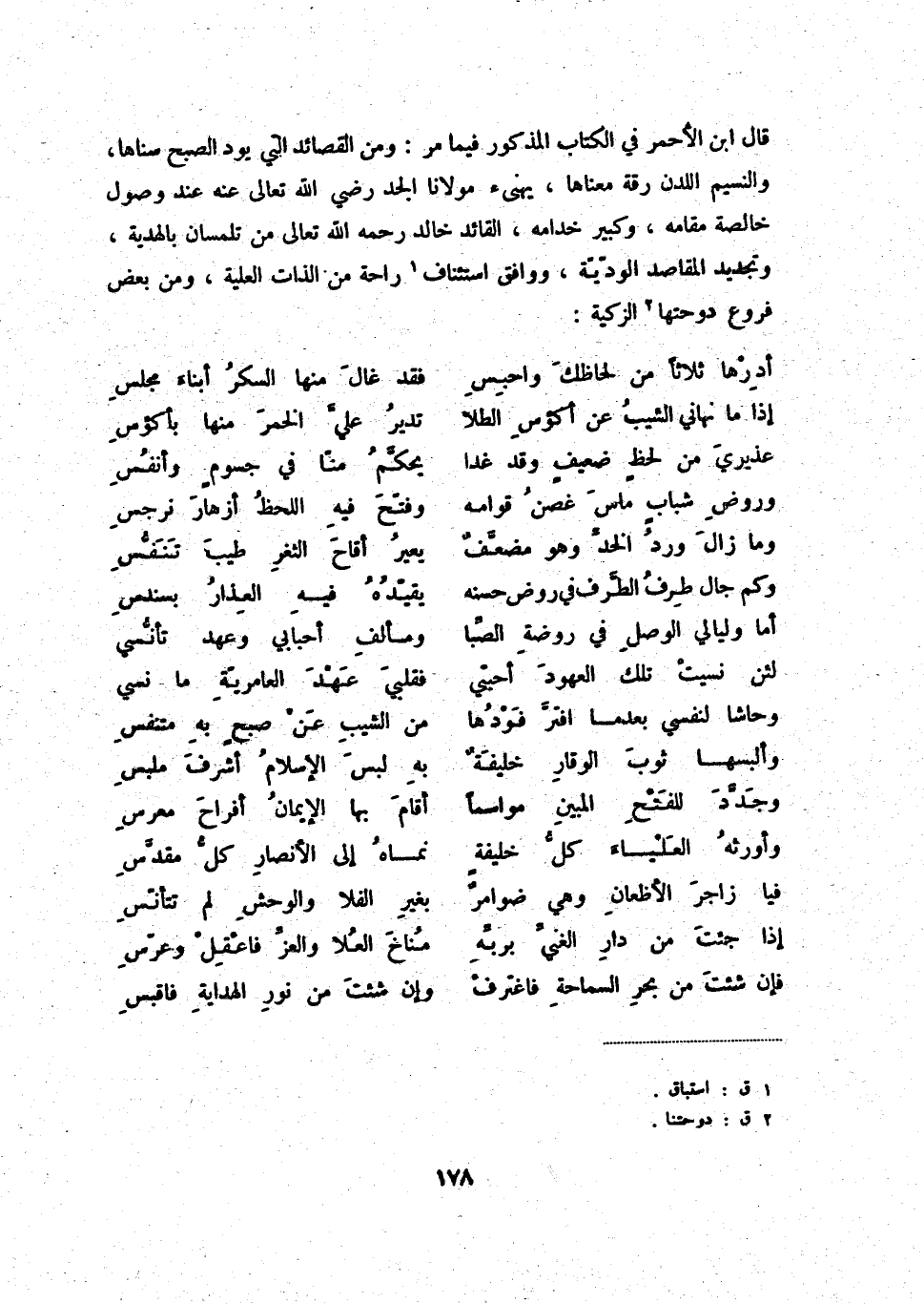 قال ابن الأحمر في الكتاب المذكور فيما مر: ومن القصائد التي يود الصبح سناها، والنسيم اللدن رقة معناها، يهنىء مولانا الجد رضي الله تعالى عنه عند وصول خالصة مقامه، وكبير خدامه، القائد خالد رحمه الله تعالى من تلمسان بالهدية، وتجديد المقاصد الودّيّة، ووافق استئناف (1) راحة من الذات العلية، ومن بعض فروع دوحتها (2) الزكية: