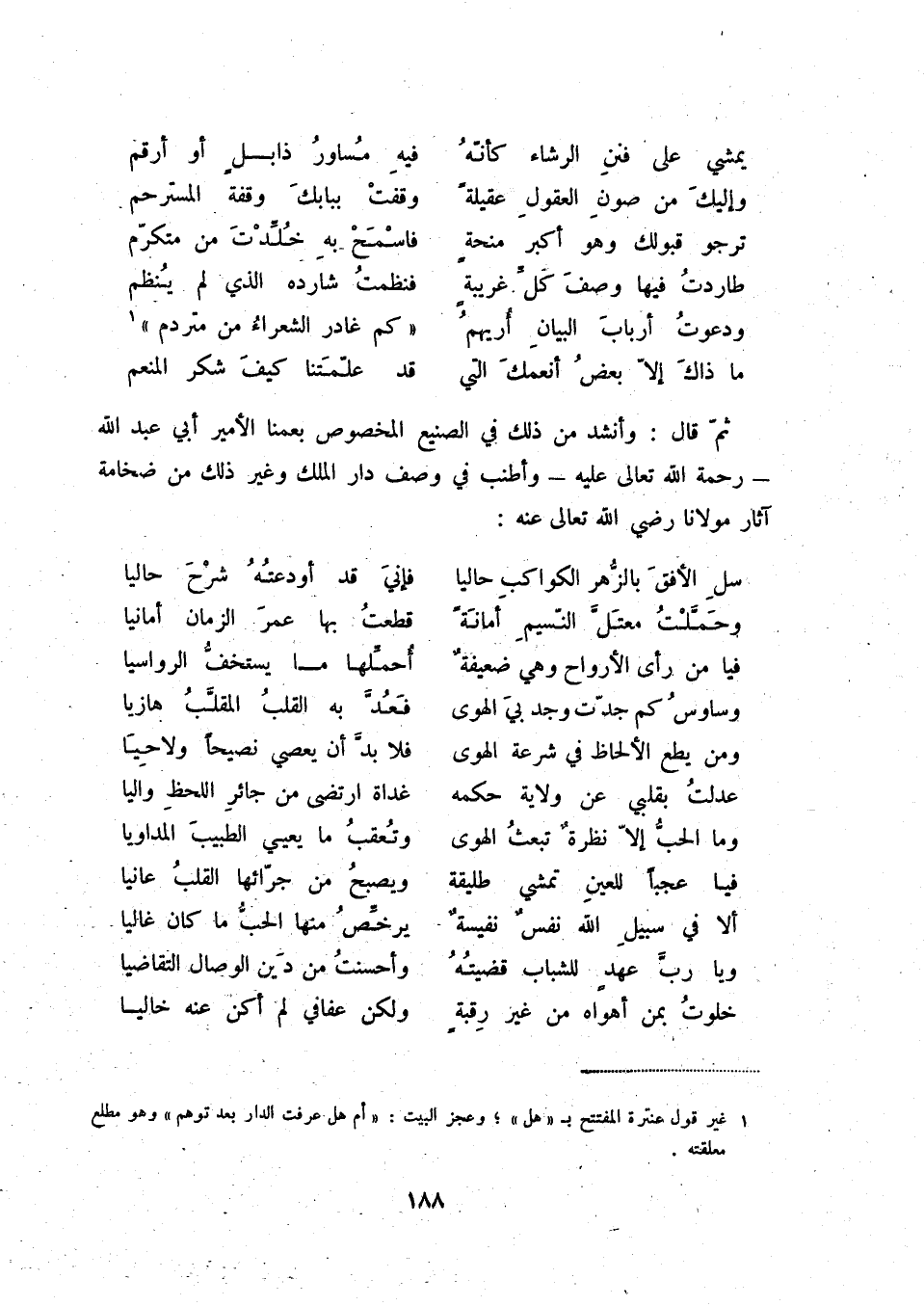 ما ذاك إلاّ بعض أنعمك التي ... قد علّمتنا كيف شكر المنعم ثمّ قال: وأنشد من ذلك في الصنيع المخصوص بعمنا الأمير أبي عبد الله - رحمة الله تعالى عليه - وأطنب في وصف دار الملك وغير ذلك من ضخامة آثار مولانا رضي الله تعالى عنه: