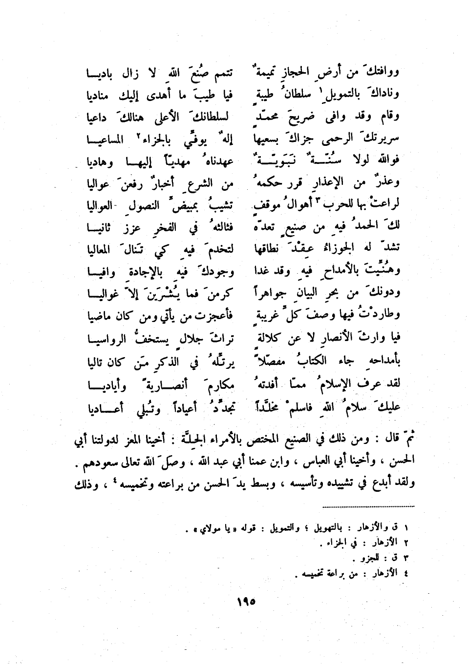 عليك سلام الله فاسلم مخلّداً ... تجدّد أعياداً وتبلي أعاديا ثمّ قال: ومن ذلك في الصنيع المختص بالأمراء الجلّة: أخينا المعز لدولتنا أبي الحسن، وأخينا أبي العباس، وابن عمنا أبي عبد الله، وصل الله تعالى سعودهم. ولقد أبدع في تشييده وتأسيسه، وبسط يد الحسن من براعته وتخميسه (4) ، وذلك