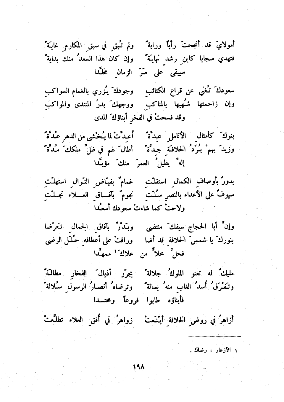 وزيد بهم برد الخلافة جدّة ... أطال لهم في ظلّ ملكك مدّة إله يطيل العمر منك مؤبّدا ...