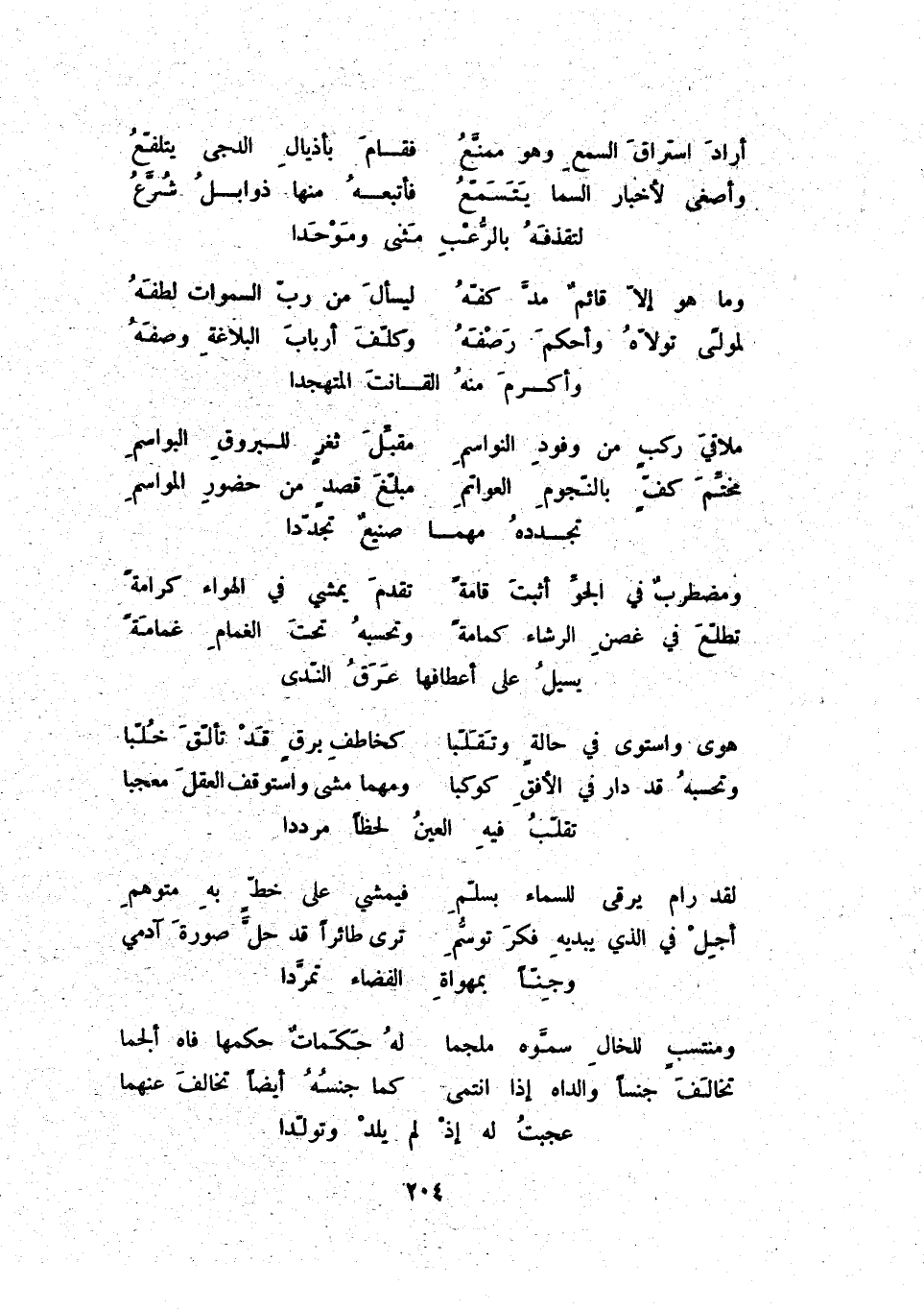 أجل في الذي يبديه فكر توسّم ... ترى طائراً قد حلّ صورة آدمي وجنّاً بمهواة الفضاء تمرّدا ...