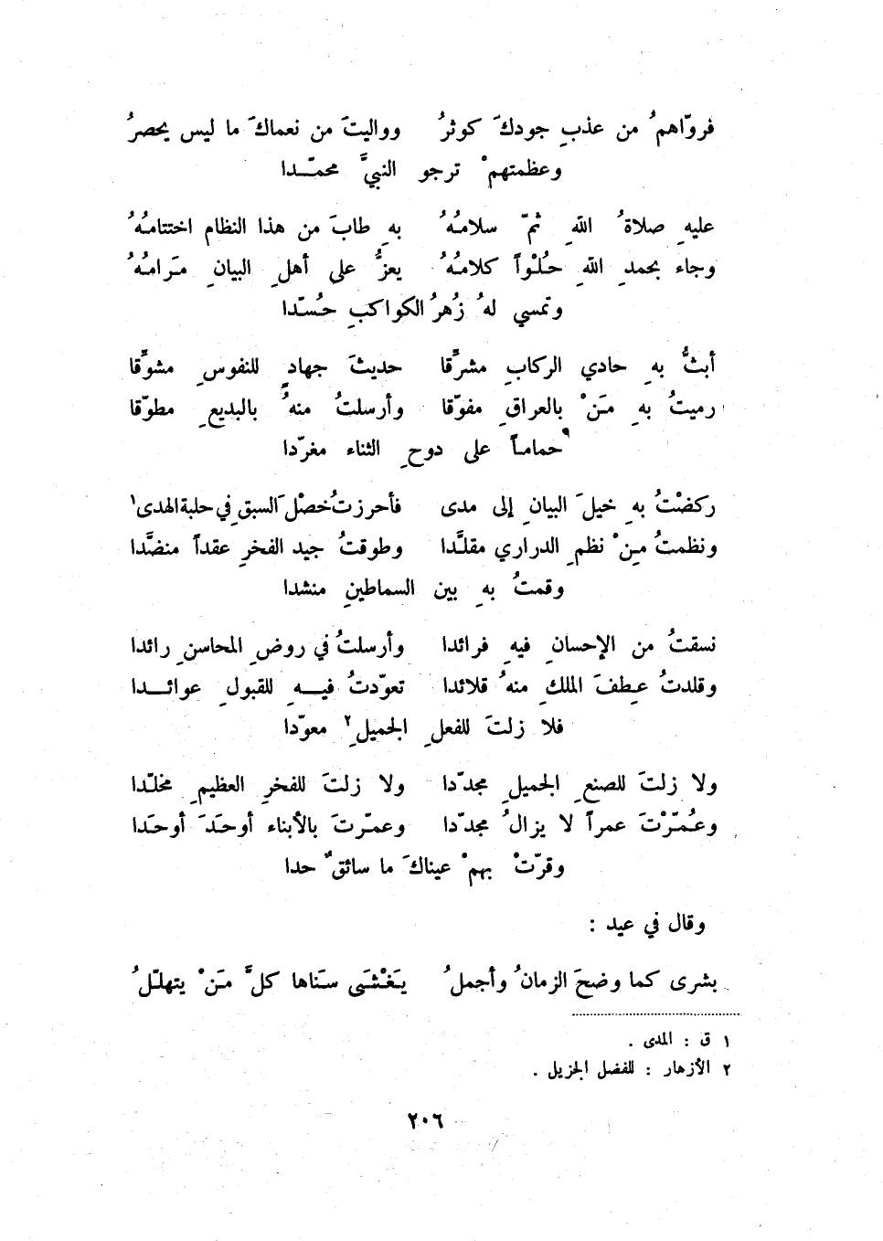 ونظمت من نظم الدراري مقلّدا ... وطوقت جيد الفخر عقداً منضّدا وقمت به بين السماطين منشدا ...