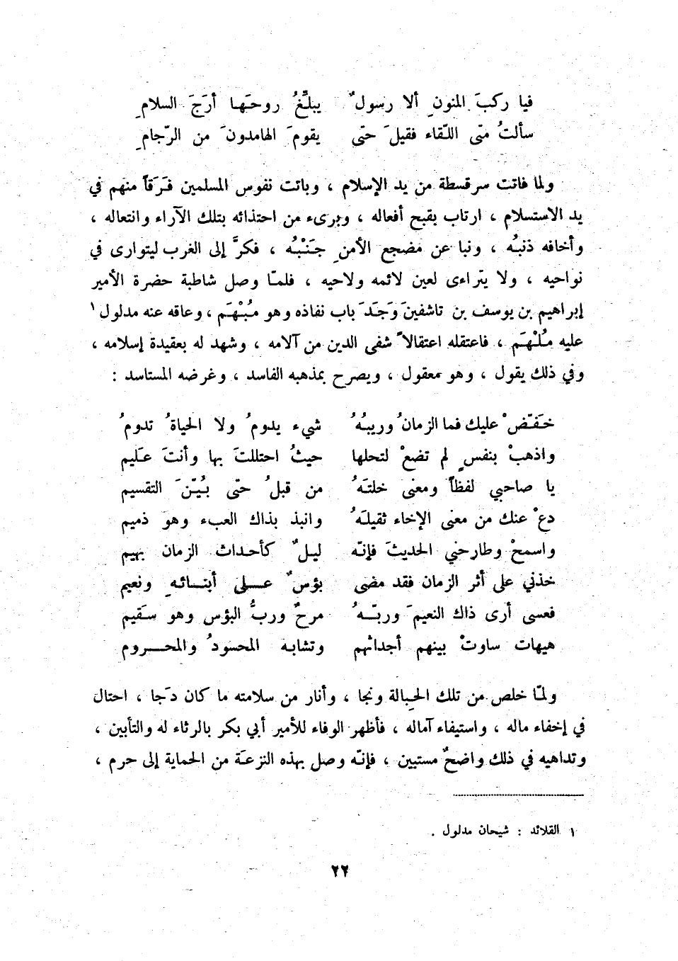 سألت متى اللّقاء فقيل حتى ... يقوم الهامدون من الرّجام ولما فاتت سرقسطة من يد الإسلام، وباتت نفوس المسلمين فرقاً منهم في يد الاستسلام، ارتاب بقبح أفعاله، وبرىء من احتذائه بتلك الآراء وانتعاله، وأخافه ذنبه، ونبا عن مضجع الأمن جنبه، فكرّ إلى الغرب ليتوارى في نواحيه، ولا يتراءى لعين لائمه ولاحيه، فلمّا وصل شاطبة حضرة الأمير إبراهيم بن يوسف بن تاشفين وجد باب نفاذه وهو مبهم، وعاقه عنه مدلول (1) عليه ملهم، فاعتقله اعتقالاً شفى الدين من آلامه، وشهد له بعقيدة إسلامه، وفي ذلك يقول، وهو معقول، ويصرح بمذهبه الفاسد، وغرضه المستاسد:
