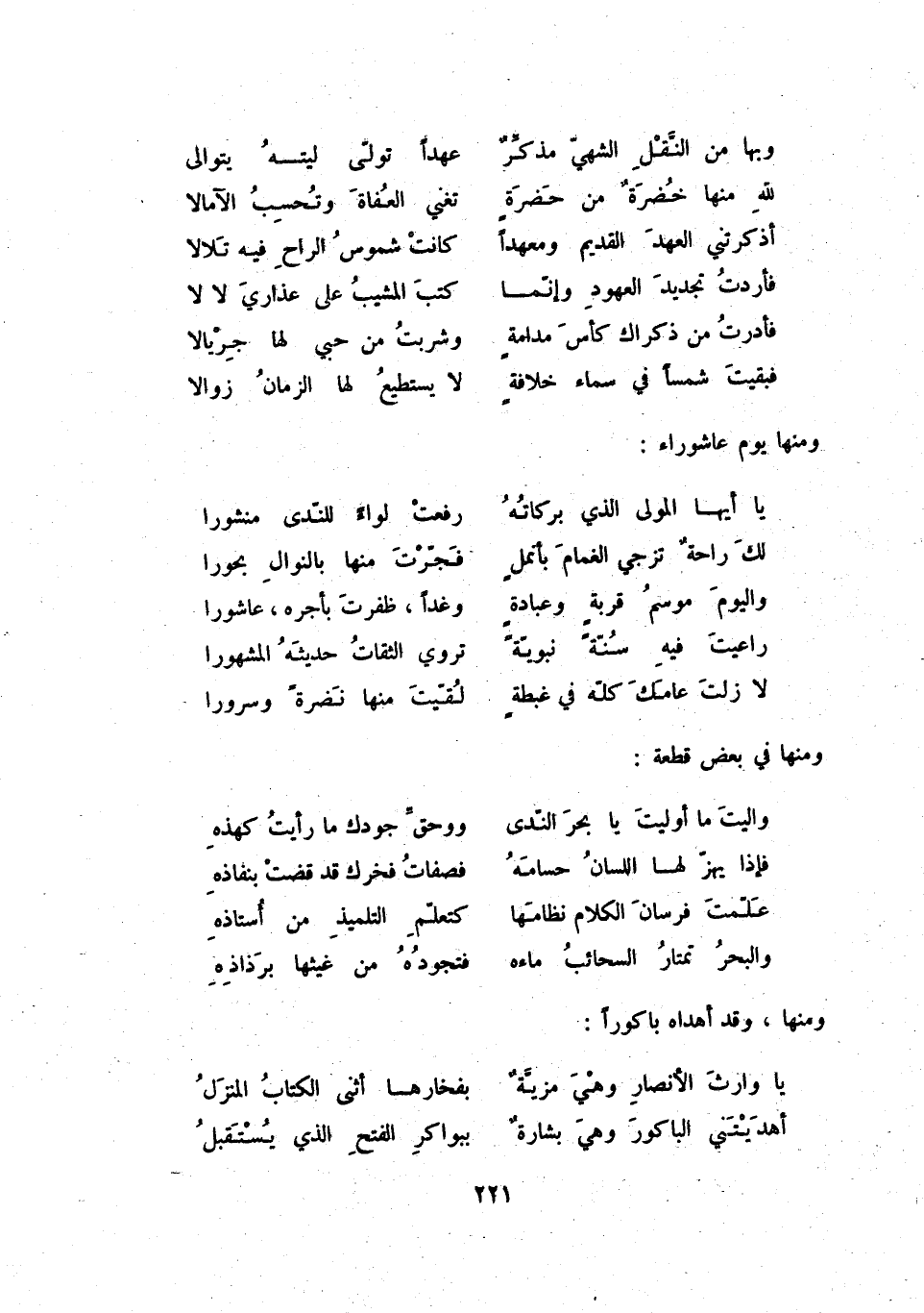 لا زلت عامك كلّه في غبطة ... لقّيت منها نضرة وسرورا ومنها في بعض قطعة: