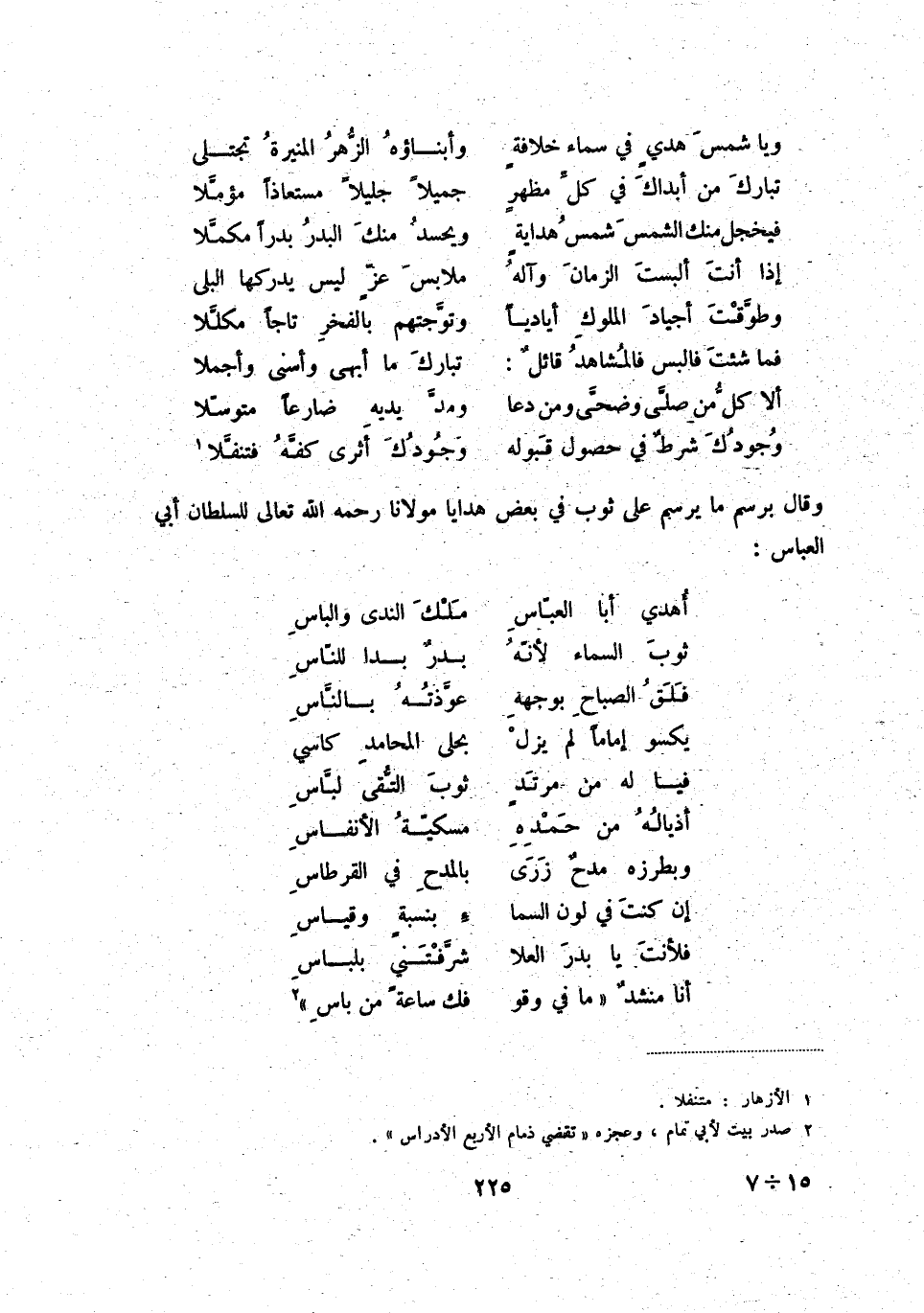 وجودك شرط في حصول قبوله ... وجودك أثرى كفّه فتنفّلا (1) وقال برسم ما يرسم على ثوب في بعض هدايا مولانا رحمه الله تعالى للسلطان أبي العباس: