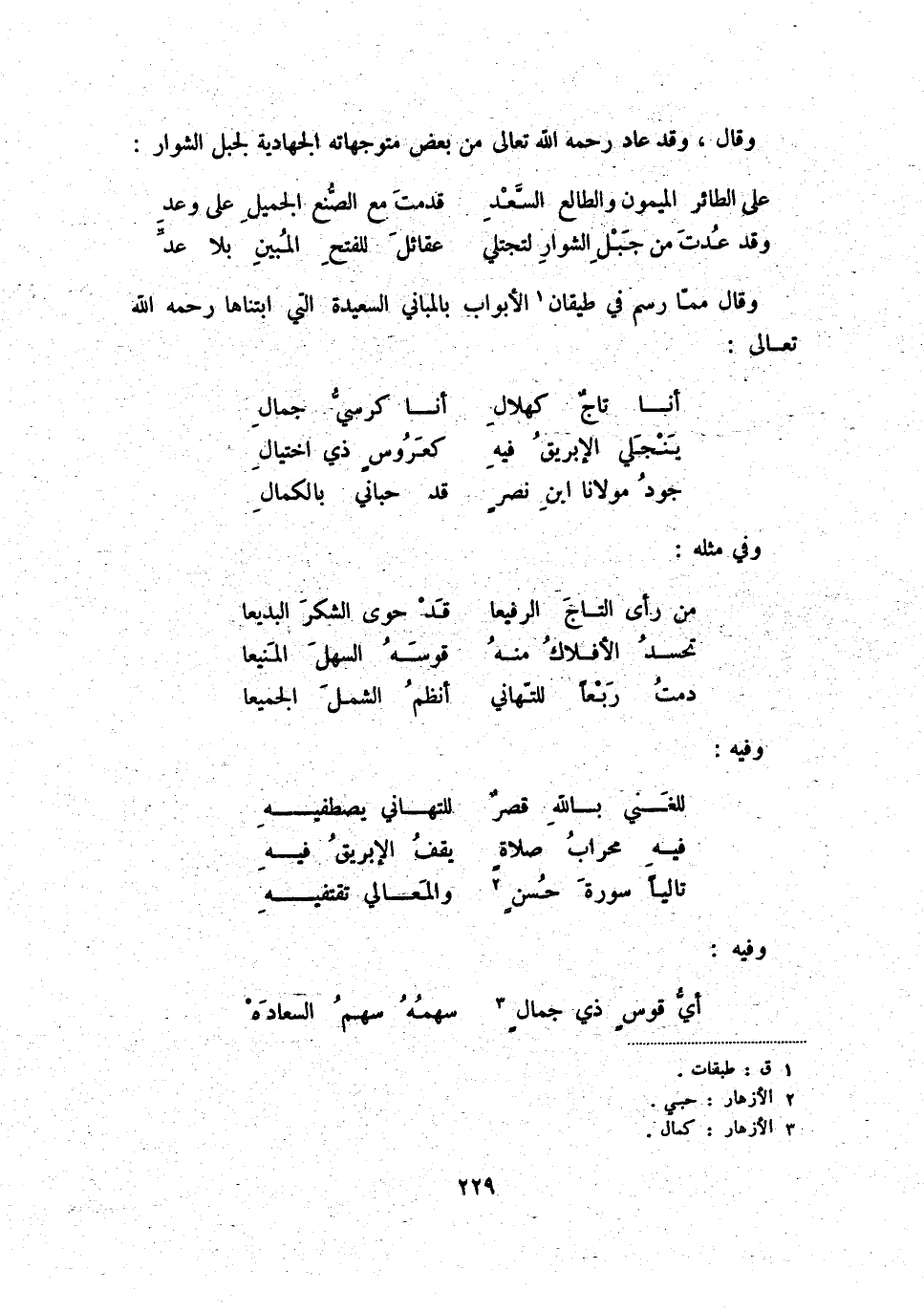 وقد عدت من جبل الشوار لتجتلي ... عقائل للفتح المبين بلا عدّ وقال ممّا رسم في طيقان (1) الأبواب بالمباني السعيدة التي ابتناها رحمه الله تعالى: