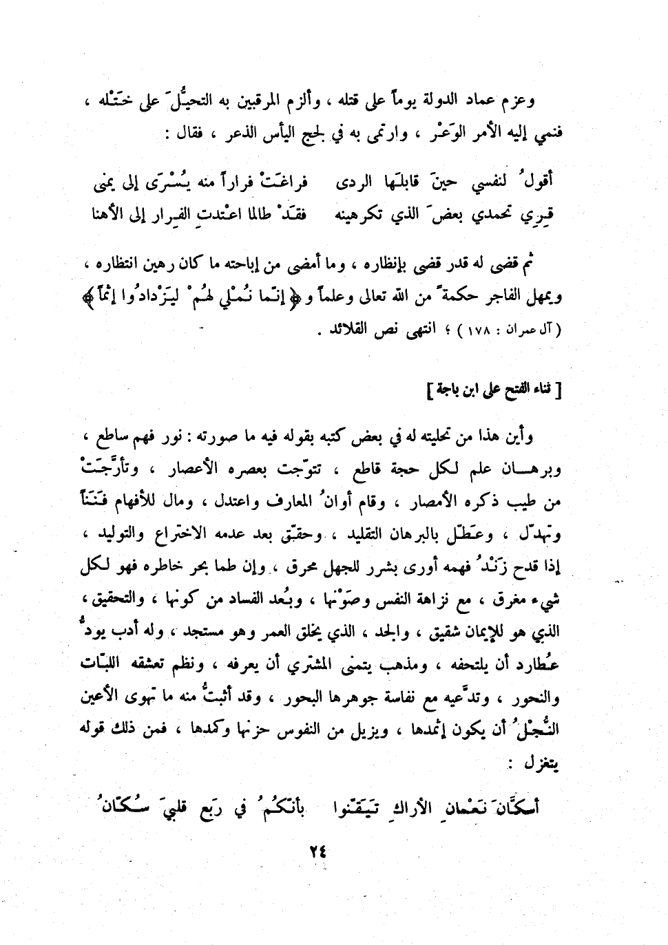 قري تحمدي بعض الذي تكرهينه ... فقد طالما اعتدت الفرار إلى الأهنا ثم قضى له قدر قضى بإنظاره، وما أمضى من إباحته ما كان رهين انتظاره، ويمهل الفاجر حكمةً من الله تعالى وعلماً و {إنّما نملي لهم ليزدادوا إثماً} (آل عمران: 178) ؛ انتهى نص القلائد.