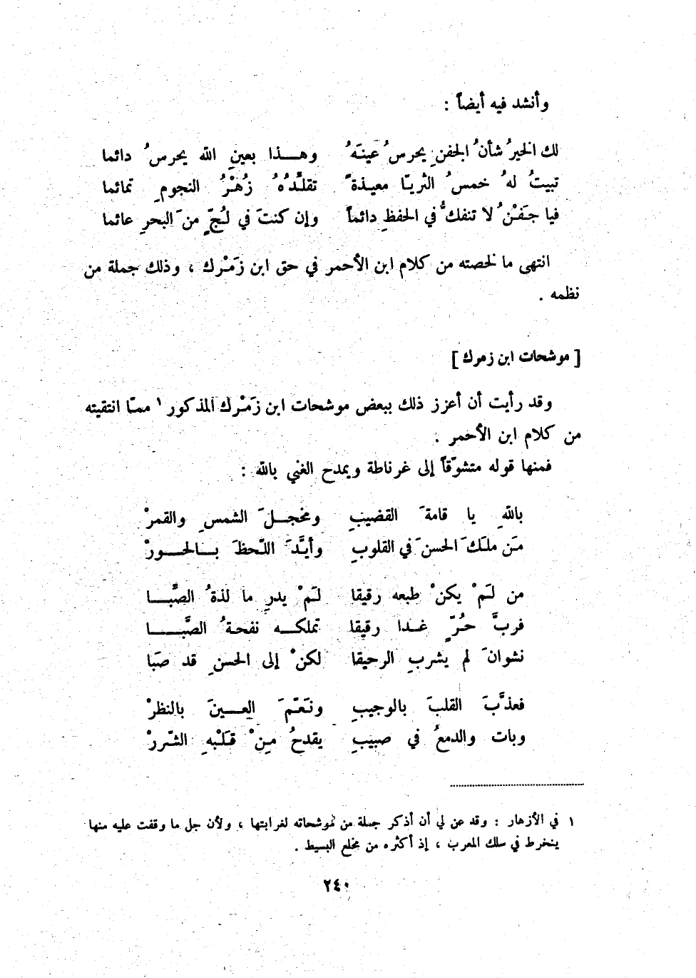 (1) في الأزهار: وقد عن لي أن أذكر جملة من موشحاته لغرابتها، ولأن جل ما وقفت عليه منها ينخرط في سلك المعرب، إذ أكثره من مخلع البسيط.
