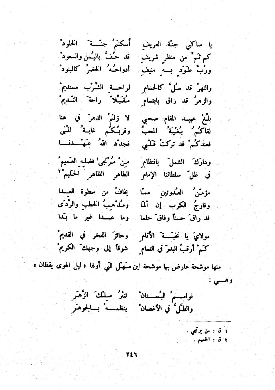 كم أرقب البدر في التمام ... شوقاً إلى وجهك الكريم منها موشحة عارض بها موشحة ابن سهل التي أولها ليل الهوى يقظان وهي: