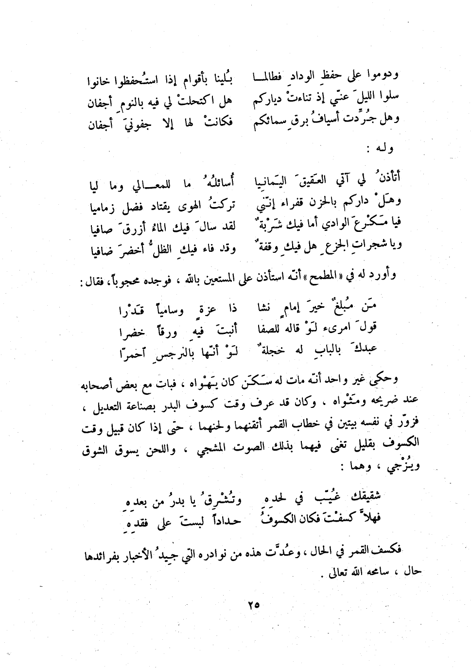 عبدك بالباب له خجلة ... لو أنّها بالنرجس احمرّا وحكى غير واحد أنّه مات له سكن كان يهواه، فبات مع بعض أصحابه عند ضريحه ومثواه، وكان قد عرف وقت كسوف البدر بصناعة التعديل، فزوّر في نفسه بيتين في خطاب القمر أتقنهما ولحنهما، حتى إذا كان قبيل وقت الكسوف بقليل تغنى فيهما بذلك الصوت المشجي، واللحن يسوق الشوق ويزجي، وهما: