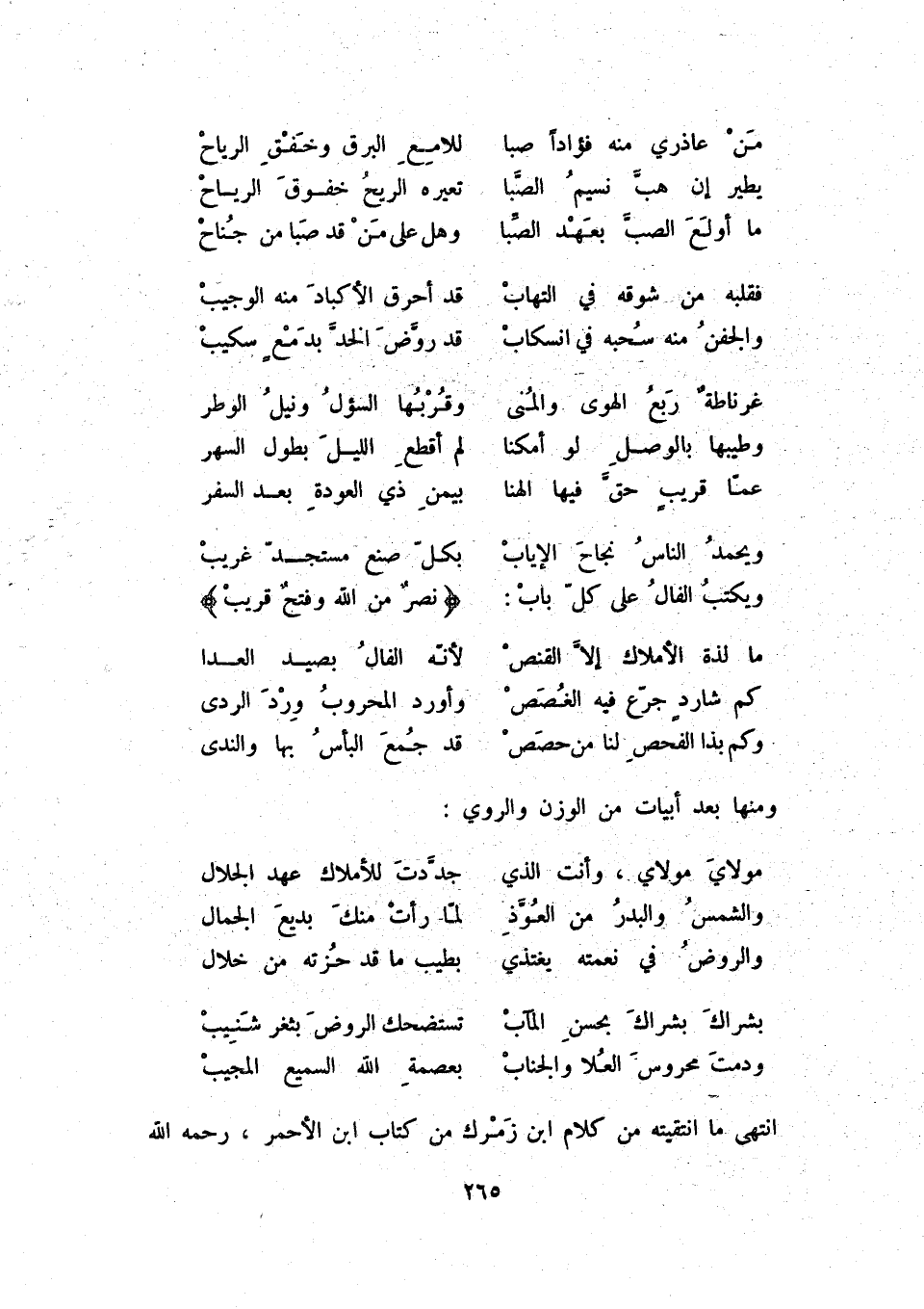 ودمت محروس العلا والجناب ... بعصمة الله السميع المجيب انتهى ما انتقيته من كلام ابن زمرك من كتاب ابن الأحمر، رحمه الله