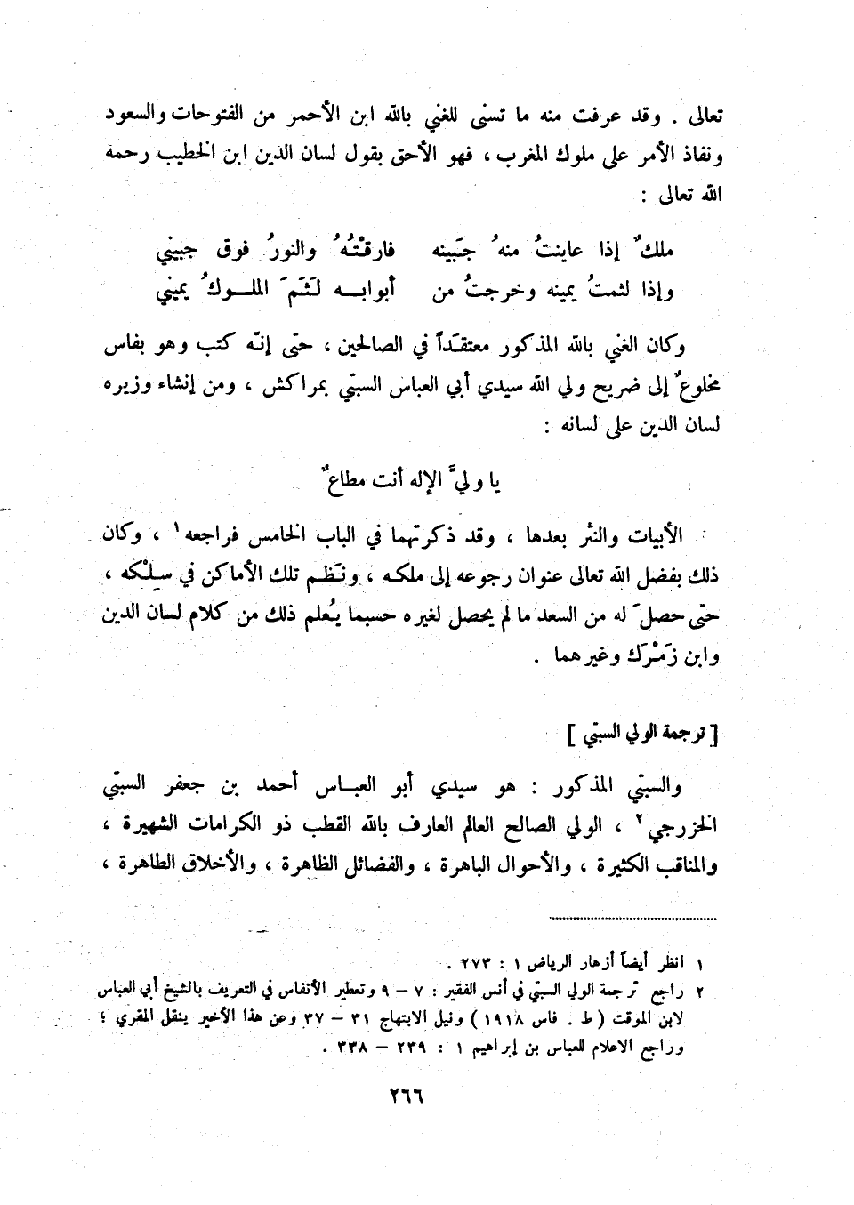 وإذا لثمت يمينه وخرجت من ... أبوابه لثم الملوك يميني وكان الغني بالله المذكور معتقداً في الصالحين، حتى إنّه كتب وهو بفاس مخلوع إلى ضريح ولي الله سيدي أبي العباس السبتي بمراكش، ومن إنشاء وزيره لسان الدين على لسانه: