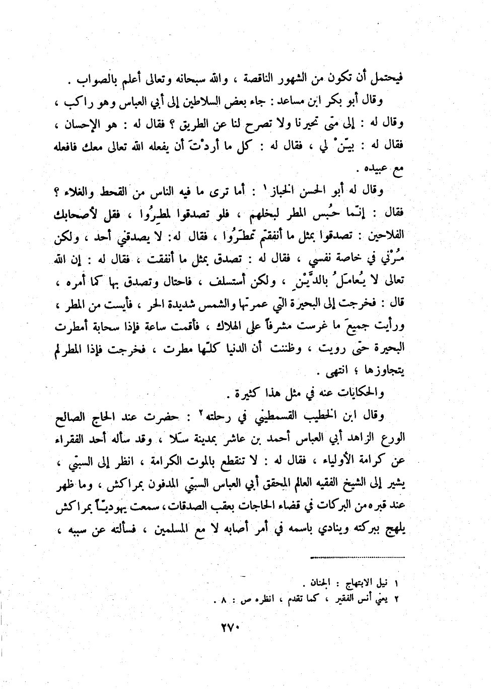 وقال له أبو الحسن الخباز (1) : أما ترى ما فيه الناس من القحط والغلاء فقال: إنّما حبس المطر لبخلهم، فلو تصدقوا لمطروا، فقل لأصحابك الفلاحين: تصدقوا بمثل ما أنفقتم تمطروا، فقال له: لا يصدقني أحد، ولكن مرني في خاصة نفسي، فقال له: تصدق بمثل ما أنفقت، فقال له: إن الله تعالى لا يعامل بالدّين، ولكن أستسلف، فاحتال وتصدق بها كما أمره، قال: فخرجت إلى البحيرة التي عمرتها والشمس شديدة الحر، فأيت من المطر، ورأيت جميع ما غرست مشرفاً على الهلاك، فأقمت ساعة فإذا سحابة أمطرت البحيرة حتى رويت، وظننت أن الدنيا كلّها مطرت، فخرجت فإذا المطر لم يتجاوزها؛ انتهى.