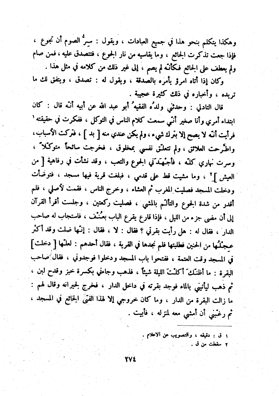 قال التادلي: وحدثني ولده الفقيه أبو عبد الله عن أبيه أنّه قال: كان ابتداء أمري وأنا صغير أنّي سمعت كلام الناس في التوكل، ففكرت في حقيقته (1) فرأيت أنّه لا يصح إلا بترك شيء، ولم يكن عندي منه [بد] ، فتركت الأسباب، واطّرحت العلائق، ولم تتعلّق نفسي بمخلوق، فخرجت سائحاً متوكّلاً، وسرت نهاري كلّه فأجهدني الجوع والتعب، وقد نشأت في رفاهية [من العيش] (2) ، وما مشيت قط على قدمي، فبلغت قرية فيها مسجد، فتوضأت ودخلت المسجد فصليت المغرب ثم العشاء، وخرج الناس، فقمت لأصلي، فلم أقدر من شدة الجوع والتألّم بالمشي، فصليت ركعتين، وجلست أقرأ القرآن إلى أن مضى جزء من الليل، فإذا قارع يقرع الباب بعنف، فاستجاب له صاحب الدار، فقال له: هل رأيت بقرتي فقال: لا، فقال: إنّها ضلت وقد أكثر عجلها من الحنين فطلبتها فلم نجدها في القرية، فقال أحدهم: لعلّها [دخلت] في المسجد وقت العتمة، ففتحوا باب المسجد ودخلوا فوجدوني، فقال صاحب البقرة: ما أظنّك أكلت الليلة شيئاً، فذهب وجاءني بكسرة خبز وقدح لبن، ثم ذهب ليأتيني بالماء فوجد بقرته في داخل الدار، فخرج لجيرانه وقال لهم: ما زالت البقرة من الدار، وما كان خروجي إلا لهذا الفتى الجائع في المسجد، ثم رغّبني أن أمشي معه لمنزله، فأبيت.