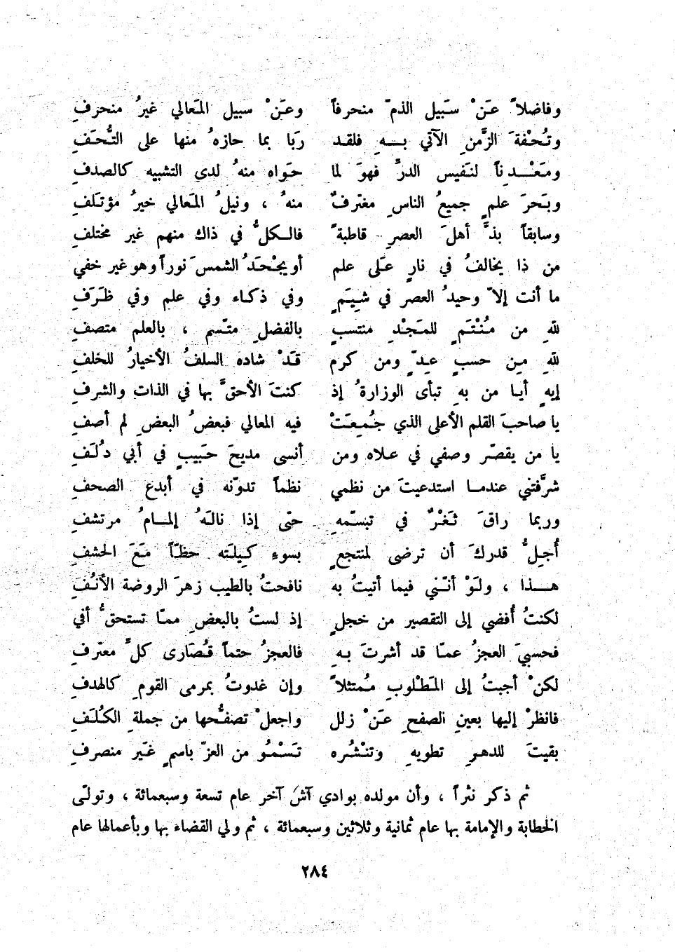 بقيت للدهر تطويه وتنشره ... تسمو من العزّ باسمٍ غير منصرف ثم ذكر نثراً، وأن مولده بوادي آش آخر عام تسعة وسبعمائة، وتولّى الخطابة والإمامة بها عام ثمانية وثلاثين وسبعمائة، ثم ولي القضاء بها وبأعمالها عام