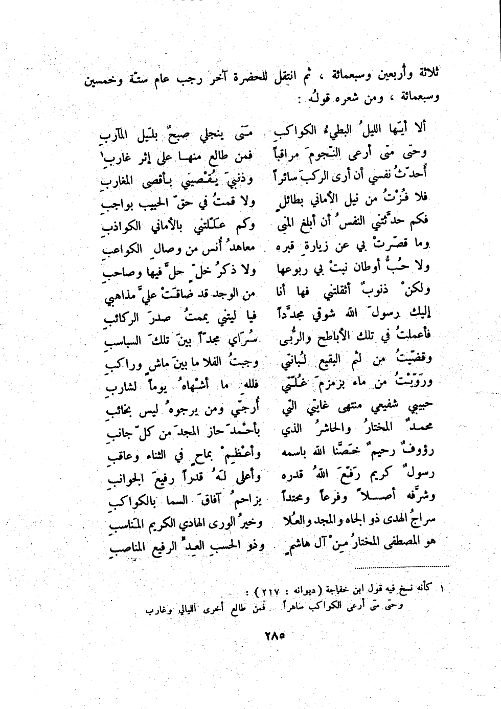 وحتى متى أرعى النّجوم مراقباً ... فمن طالع منها على إثر غارب (1)