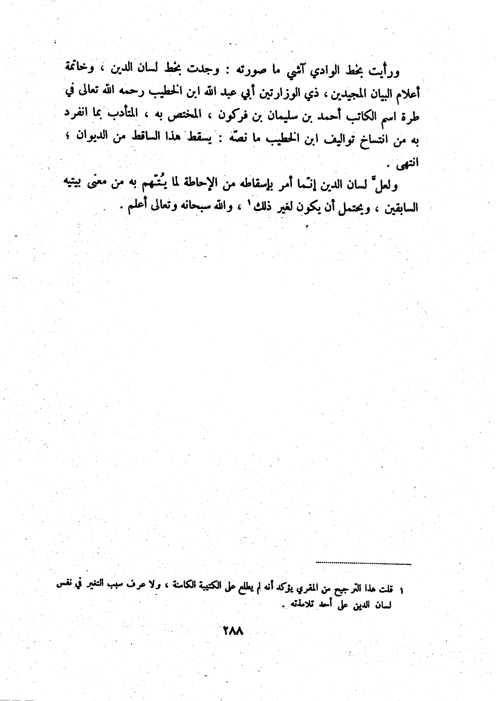 ولعلّ لسان الدين إنّما أمر بإسقاطه من الإحاطة لما يتّهم به من معنى بيتيه السابقين، ويحتمل أن يكون لغير ذلك (1) ، والله سبحانه وتعالى أعلم.