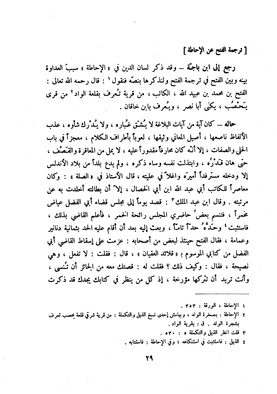 رجع إلى ابن باجّة - وقد ذكر لسان الدين في الإحاطة سبب العداوة بينه وبين الفتح في ترجمة الفتح ولنذكرها بنصّه فنقول (1) : قال رحمه الله تعالى: الفتح بن محمد بن عبيد الله، الكاتب، من قرية تعرف بقلعة الواد (2) من قرى يحصب، يكنى أبا نصر، ويعرف بابن خاقان.