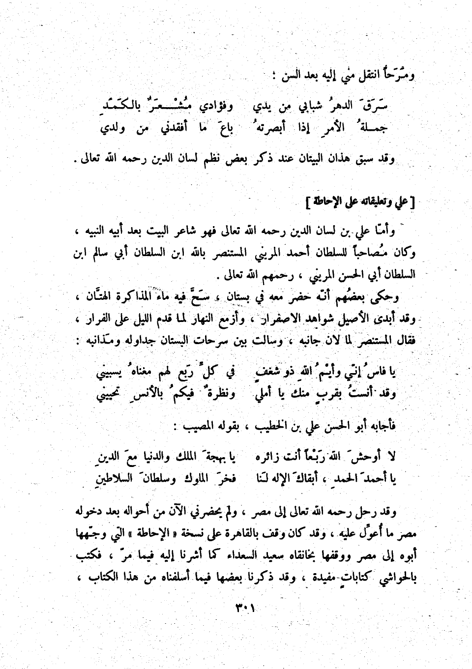 يا أحمد الحمد، أبقاك الإله لنا ... فخر الملوك وسلطان السلاطين وقد رحل رحمه الله تعالى إلى مصر، ولم يحضرني الآن من أحواله بعد دخوله مصر ما أعوّل عليه، وقد كان وقف بالقاهرة على نسخة الإحاطة التي وجّهها أبوه إلى مصر ووقفها بخانقاه سعيد السعداء كما أشرنا إليه فيما مرّ، فكتب بالحواشي كتابات مفيدة، وقد ذكرنا بعضها فيما أسلفناه من هذا الكتاب
