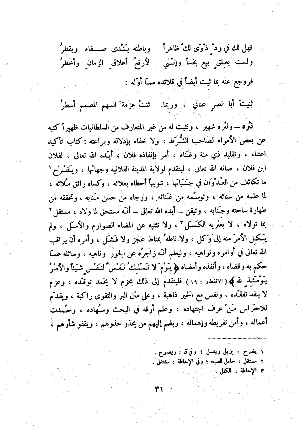 ثنيت أبا نصر عناني، وربما ... ثنت عزمة السهم المصمم أسطر نثره - ونثره شهير، ونثبت له من غير المتعارف من السلطانيات ظهيراً كتبه عن بعض الأمراء لصاحب الشُّرَط، ولا خفاء بإدلاله وبراعته: كتاب تأكيد اعتناء، وتقليد ذي منة وغناء، أمر بإنفاذه فلان، أيّده الله تعالى، لفلان ابنفلان، صانه الله تعالى، ليتقدم لولاية المدينة الفلانية وجهاتها، ويضرح (1) ما تكاثف من العدوان في جنباتها، تنويهاً أحظاه بعلائه، وكساه رائق ملائه، لما علمه من سنائه، وتوسّمه من غنائه، ورجاه من حسن منابه، وتحققه من طهارة ساحته وجنابه، وتيقن - أيده الله تعالى - أنّه مستحق لما ولاه، مستقل (2) بما تولاه، لا يعتريه الكسل (3) ، ولا تثنيه عن المضاء الصوارم والأسل، ولم يكل الأمر منه إلى وكل، ولا ناطه بمناط عجز ولا فشل، وأمره أن يراقب الله تعالى في أوامره ونواهيه، وليعلم أنّه زاجره عن الجور وناهيه، وسائله عمّا حكم به وقضاه، وأنفذه وأمضاه {يوم لا تملك نفسٌ لنفسٍ شيئاً والأمر يومئذ لله} (الإنفطار: 19) فليتقدم إلى ذلك بحزم لا يخمد توقّده، وعزم لا ينفد تفقّده، ونفس مع الخير ذاهبة، وعلى متن البر والتقوى راكبة، ويقدّم للاحتراس من عرف اجتهاده، وعلم أرقه في البحث وسهاده، وحمدت أعماله، وأمن تفريطه وإهماله، ويضم إليهم من يحذو حذوهم، ويقفو شأوهم،