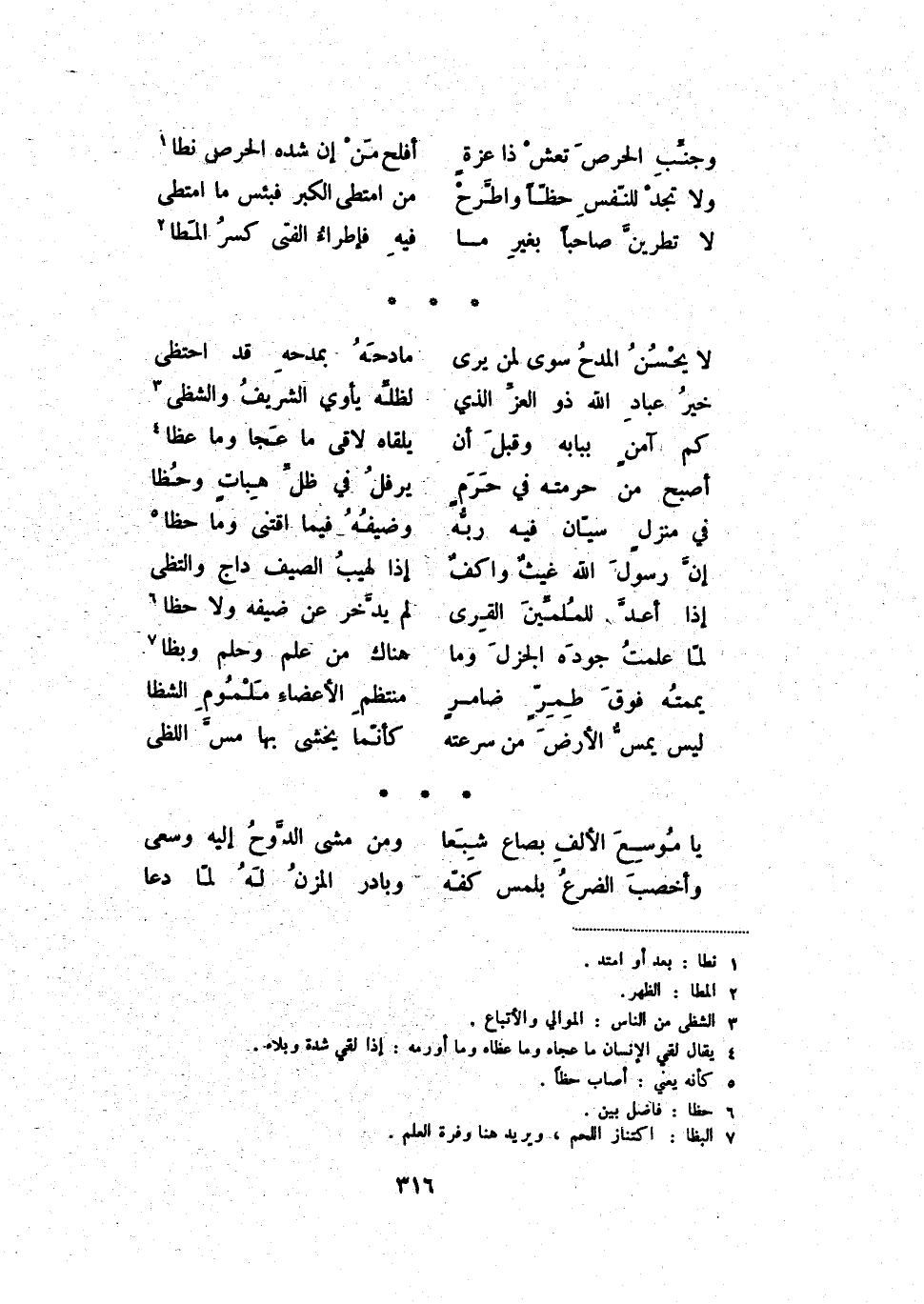 وجنّب الحرص تعش ذا عزة ... أفلح من إن شده الحرص نطا (1)