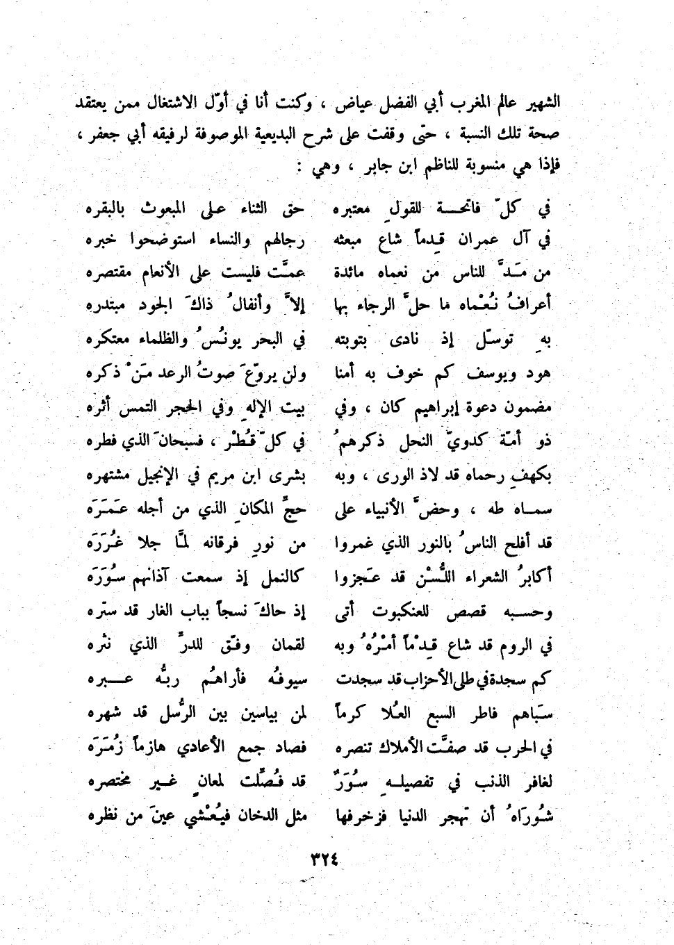 الشهير عالم المغرب أبي الفضل عياض، وكنت أنا في أوّل الاشتغال ممن يعتقد صحة تلك النسبة، حتى وقفت علىة شرح البديعية الموصوفة لرفيقه أبي جعفر، فإذا هي منسوبة للناظم ابن جابر، وهي: