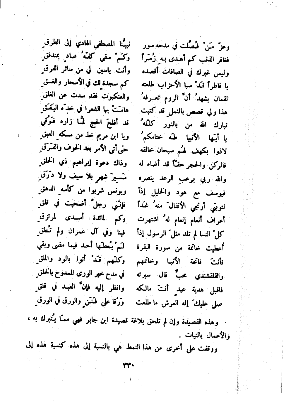 صلى عليك إله العرش ما طلعت ... ورقا على فنن والورق في الورق وهذه القصيدة وإن لم تلحق بلاغة قصيدة ابن جابر فهي ممّا يتبرك به، والأعمال بالنيات.