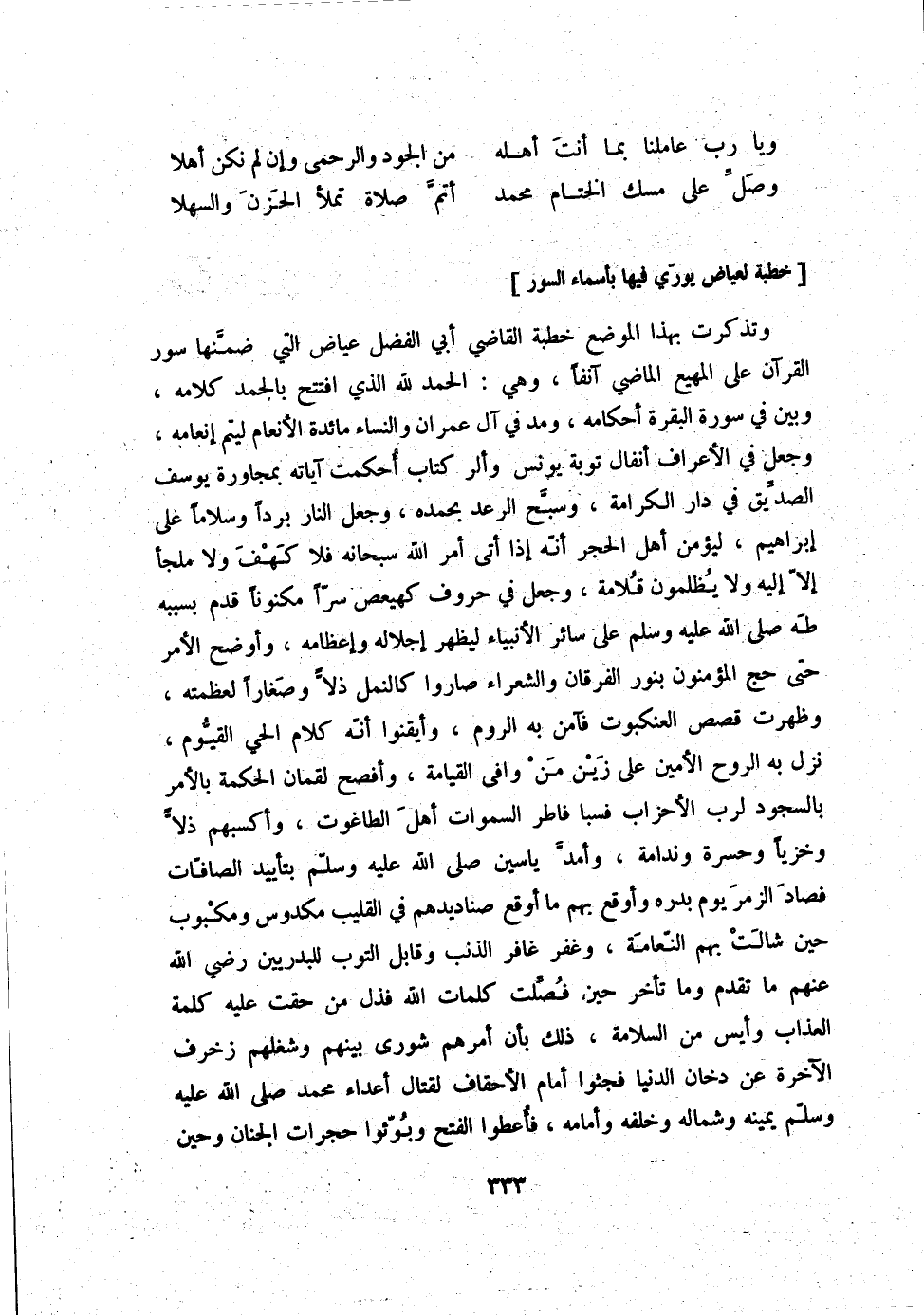 وتذكرت بهذا الموضع خطبة القاضي أبي الفضل عياض التي ضمّنها سور القرآن على المهيع الماضي آنفاً، وهي: الحمد لله الذي افتتح بالحمد كلامه، وبين في سورة البقرة أحكامه، ومد في آل عمران والنساء مائدة الأنعام ليتم إنعامه، وجعل في الأعراف أنفال توبة يونس وألر كتاب أحكمت آياته بمجاورة يوسف الصدّيق في دار الكرامة، وسبّح الرعد بحمده، وجعل النار برداً وسلاماً على إبراهيم، ليؤمن أهل الحجر أنّه إذا أتى أمر الله سبحانه فلا كهف ولا ملجأ إلاّ إليه ولا يظلمون قلامة، وجعل في حروف كهيعص سرّاً مكنوناً قدمم بسببه طه صلى الله عليه وسلّم على سائر الأنبياء ليظهر إجلاله وإعظامه، وأوضح الأمر حتى حج المؤمنون بنور الفرقان والشعراء صاروا كالنمل ذلاً وصغاراً لعظمته، وظهرت قصص العنكبوت فآمن به الروم، وأيقنوا أنّه كلام الحي القيّوم، نزل به الروح الأمين على زين من وافى القيامة، وأفصح لقمان الحكمة بالأمر بالسجود لرب الأحزاب فسبا فاطر السموات أهل الطاغوت، وأكسبهم ذلاً وخزياً وحسرة وندامة، وأمدّ ياسين صلى الله عليه وسلّم بتأييد الصافّات فصاد الزمر يوم بدره وأوقع بهم ما أوقع صناديهم في القليب مكدوس ومكبوب حين شالت بهم النّعامة، وغفر غافر الذنب وقابل التوب للبدريين رضي الله عنهم ما تقدم وما تأخر حين فصّلت كلمات الله فذل من حقت عليه كلمة العذاب وأيس من السلامة، ذلك بأن أمرهم شورى بينهم وشغلهم زخرف الآخرة عن دخان الدنيا فجثوا أمام الأحقاف لقتال أعداء محمد صلى الله عليه وسلّم يمينه وشماله وخلفه وأمامه، فأعطوا الفتح وبوّئوا حجرات الجنان وحين