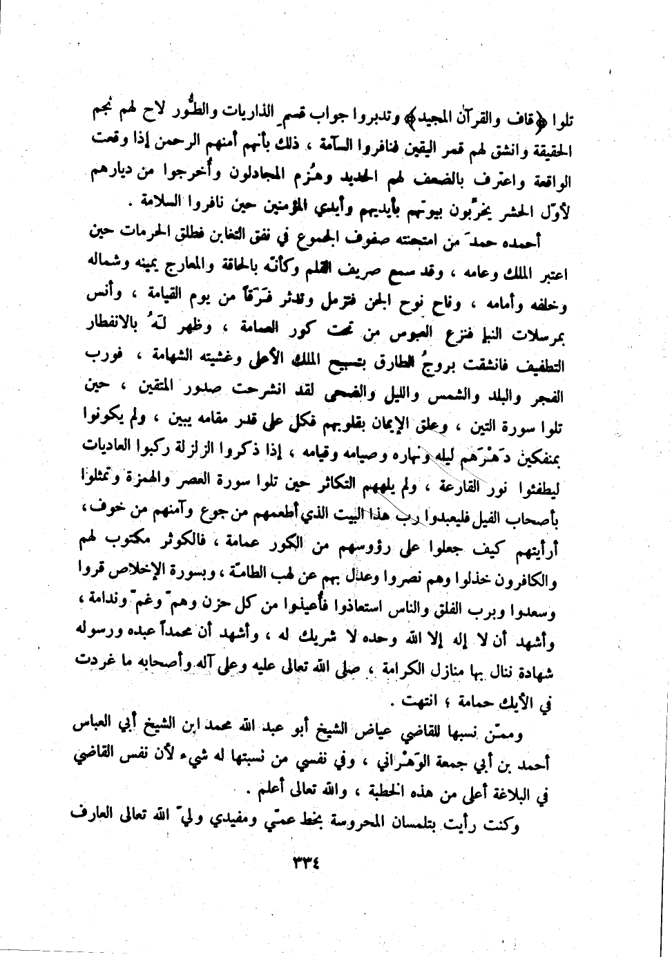 أحمده حمد من امتحنته صفوف الجموع في نفق التغابن فطلق الحرمات حين اعتبر الملك وعامه، وقد سمع صريف القلم وكأنه بالحاقة والمعارج يمينه وشماله وخلفه وأمامه، وناح نوح الجن فتزمل وتدثر فرقاً من يوم القيامة، وأنس بمرسلات النبإ فنزع العبوس من تحت كور العمامة، وظهر له بالانفطار التطفيف فانشقت بروح الطارق بتسبيح الملك الأعلى وغشيته الشهامة، فورب الفجر والبلد والشمس والليل والضحى لقد انشرحت صدور المتقين، حين تلوا سورة التين، وعلق الإيمان بقلوبهم فكل على قدر مقامه يبين، ولم يكونوا بمنفكين دهرهم ليله ونهاره وصيامه وقيامه، إذا ذكروا الزلزلة ركبوا العاديات ليطفئوا نور القارعة، ولم يلههم التكاثر حين تلوا سورة العصر والهمزة وتمثلوا بأصحاب الفيل فليعبدوا رب هذا البيت الذي أطعمهم من جوع وآمنهم من خوف، أرأيتهم كيف جعلوا على رؤوسهم من الكور عمامة، فالكوثر مكتوب لهم والكافرون خذلوا وهم نصروا وعدل بهم عن لهب الطامّة، وبسورة الإخلاص قروا وسعدوا وبرب الفلق والناس اتسعاذوا فأعيذوا من كل حزن وهمّ وغمّ وندامة، وأشهد أن لا إله إلا الله وحده لا شريك له، وأشهد أن محمداً عبده ورسوله شهادة ننال بها منازل الكرامة، صلى الله تعالى عليه وعلى آله وأصحابه ما غردت في الأيك حمامة؛ انتهت.