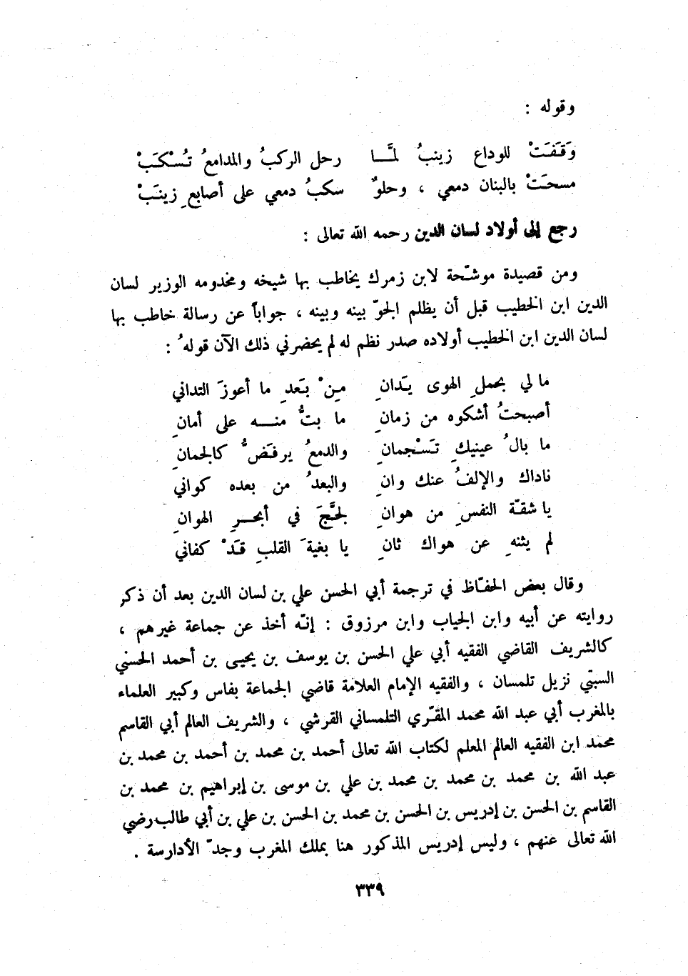 مسحت بالبنان دمعي، وحلو ... سكب دمعي على أصابع زينب رجع إلى أولاد لسان الدين رحمه الله تعالى: