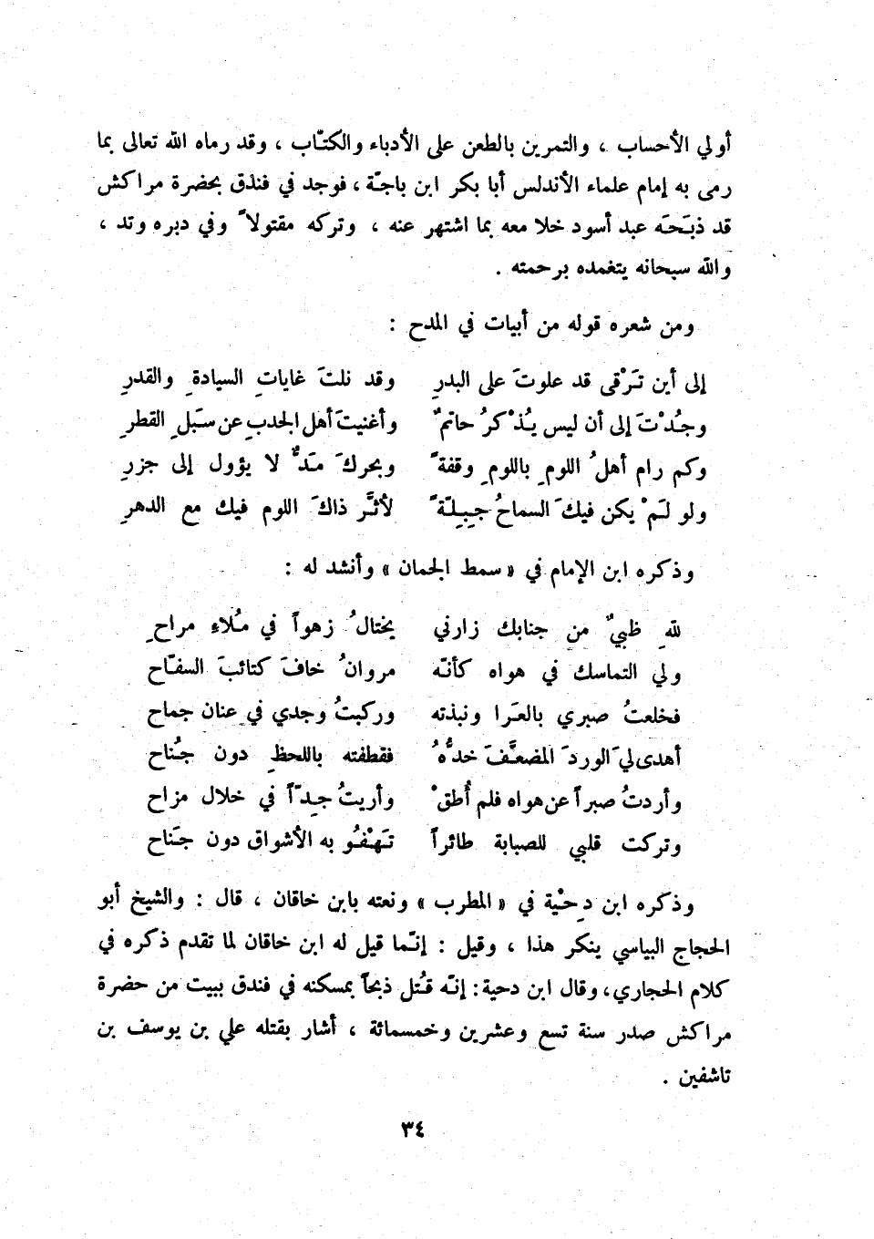 وتركت قلبي للصبابة طائراً ... تهفو به الأشواق دون جناح وذكره ابن دحية في المطرب ونعته بابن خاقان، قال: والشيخ أبو الحجاج البياسي ينكر هذا، وقيل: إنّما قيل له ابن خاقان لما تقدم ذكره في كلام الحجاري، وقال ابن دحية: إنّه قتل ذبحاً بمسكنه في فندق ببيت من حضرة مراكش صدر سنة تسع وعشرين وخمسمائة، أشار بقتله علي بن يوسف بن تاشفين.