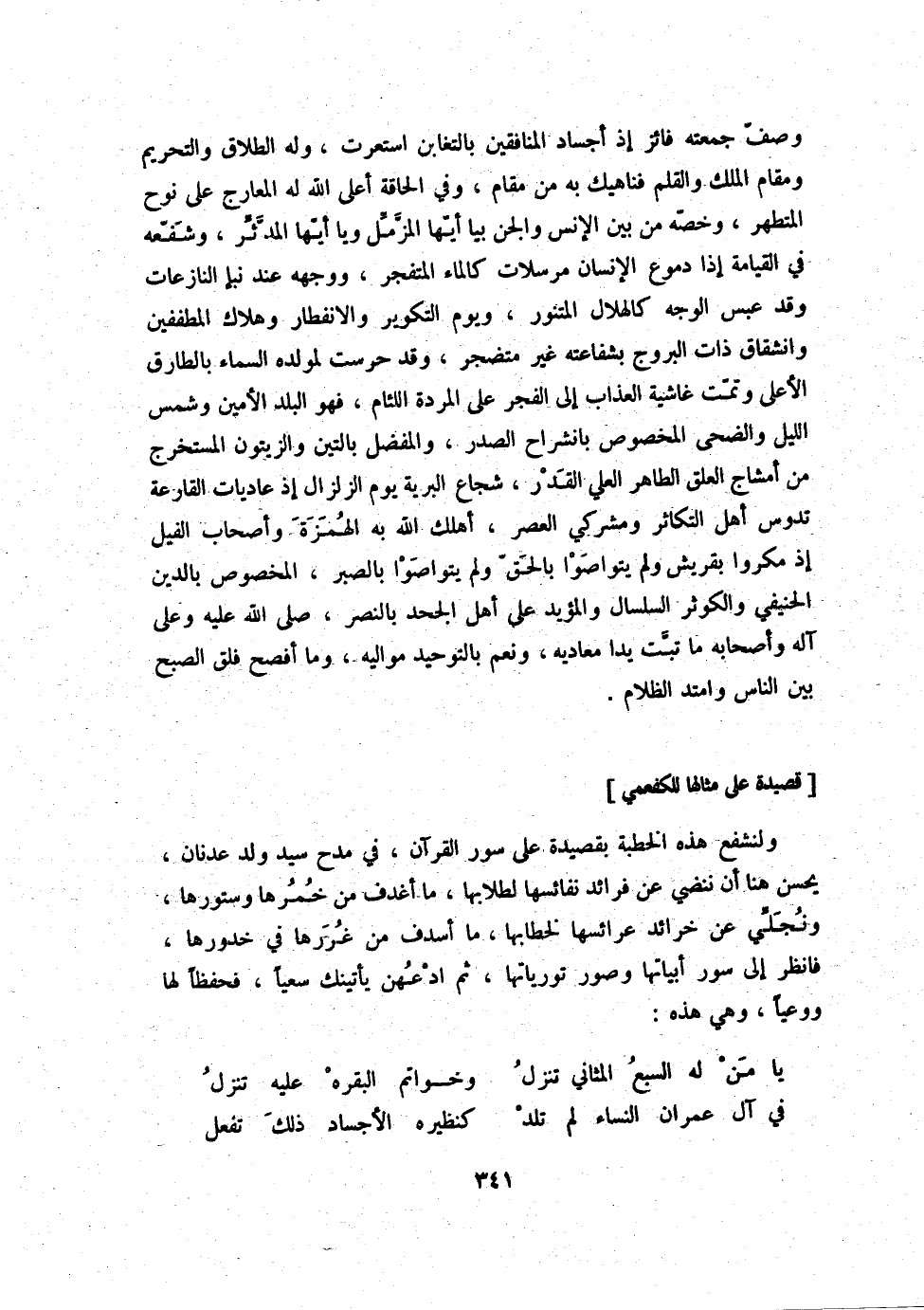 وصفّ جمعته فائز إذ أجساد المنافقين بالتغابن استعرت، وله الطلاق والتحريم ومقام الملك والقلم فناهيك به من مقام، وفي الحاقة أعلى الله له المعارج على نوح المتطهر، وخصّه من بين الإنس والجن بيا أيّها المزّمّل ويا أيّها المدّثّر، وشفّعه في القيامة إذا دموع الإنسان مرسلات كالماء المتفجر، ووجهه عند نبإ النازعات وقد عبس الوجه كالهلال المتنور، ويوم التكوير والانفطار وهلاك المطففين وانشقاق ذات البروج بشفاعته غير متضجر، وقد حرست لمولده السماء بالطارق الأعلى وتمّت غاشية العذاب إلى الفجر لعى المردة اللئام، فهو البلد الأمين وشمس الليل والضحى المخصوص بانشراح الصدر، والمفضل بالتين والزيتون المستخرج من أمشاج العلق الطاهر العلي القدر، شجاع البرية يوم الزلزال إذ عاديات القارعة تدوس أهل التكاثر ومشركي العصر، أهلك الله به الهمزة وأصحاب الفيل إذ مكروا بقريش ولم يتواصوا بالحقّ ولم يتواصوا بالصبر، المخصوص بالدين الحنيفي والكوثر السلسال والمؤيد على أهل الجحد بالنصر، صلى الله عليه وعلى آله وأصحابه ما تبّت يدا معاديه، ونعم بالتوحيد مواليه، وما أفصح فلق الصبح بين الناس وامتد الظلام.