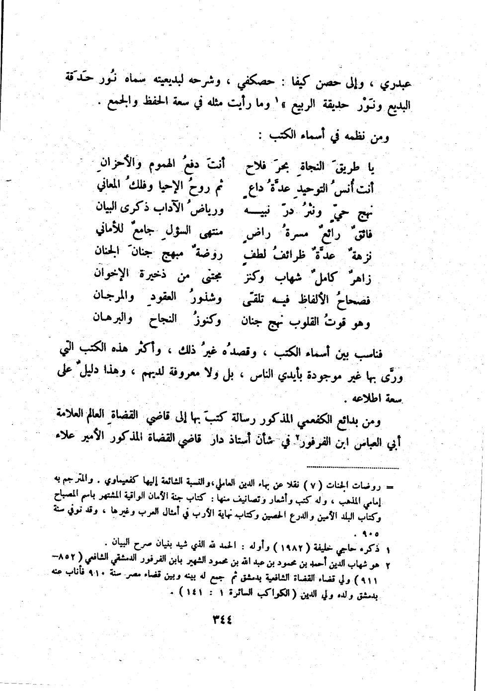 وهو قوت القلوب نهج جنان ... وكنوز النجاح والبرهان فناسب بين أسماء الكتب، وقصده غير ذلك، وأكثر هذه الكتب التي ورّى بها غير موجودة بأيدي الناس، بل ولا معروفة لديهم، وهذا دليل على سعة اطلاعه.