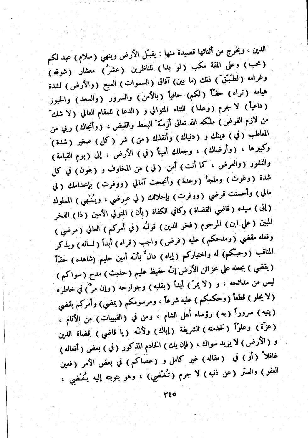 الدين، ويخرج من أثنائها قصيدة منها: يقبّل الأرض وينهي (سلام) عبد لكم محب وعلى المقة مكب لو بدا للناظرين عشر معشار شوقه وغرامه لطبّق ذلك ما بين آفاق السموات السبع والأرض لشدة هيامه تراه حقّاً لكم حافياً بالأمن والسرور والسعد والحبور داعياً لا جرم وهذا الثناء المتوالي والدعا للمقام العالي لا شكّ من لازم الفرض ملّكه الله تعالى أزمّة البسط والقبض، وأنجاك ربي من المعاطب في دينك ودنياك وأنقذك من شر كل صغير شدة وكبيرها، وأرضاك، وجعلك أميناً في الأرض، إلى يوم القيامة والنشور والعرض، كما أنت أمن لي من المخاوف وعون في كل شدة وغوث وملجأ وعدة وأنجت آمالي ووفرت بإخدامك لي مالي وأحسنت قرضي ووفرت بإجلالك لي عرضي، وينهي المملوك إلى سيده قاضي القضاة وكافي الكفاة بأن المتولي الأمين ذا الفخر المبين علي ابن المرحوم فخر الدين قوله في أمركم العالي مرضي وفعله مقضي ومدحكم عليه فرض واجب قراه أبداً لسانه ويذكر المناقب وحبّكم له واختياركم إياه دالّ بأنّه أمين حليم شاهده حقّاً يقضي بجعله على خزائن الأرض إنّه حفيظ عليم حديث مدح سواكم ليس من مدائحه، ولا يمرّ أبداً بقلبه وجوارحه وإن مرّ في خاطره لا يحلو قطعاً وحكمكم عليه شرعاً، ومرسومكم يمضي وأمركم يقضي يتيه سروراً به رؤساء أهل الشام، ومن في القبيبات من الأنام، عزّة وعلوّاً لخدمته الشريفة إياك ولأنّه يا قاضي قضاة الدين والأرض لا يريد سواك، فإن يك الخادم المذكور في بعض أفعاله غافلاً أو في مقاله غير كامل وعصاكم في بعض الأمر فعين العفو والستر عن ذنبه لا جرم تغضي، وهو بتوبته إليه يفضي