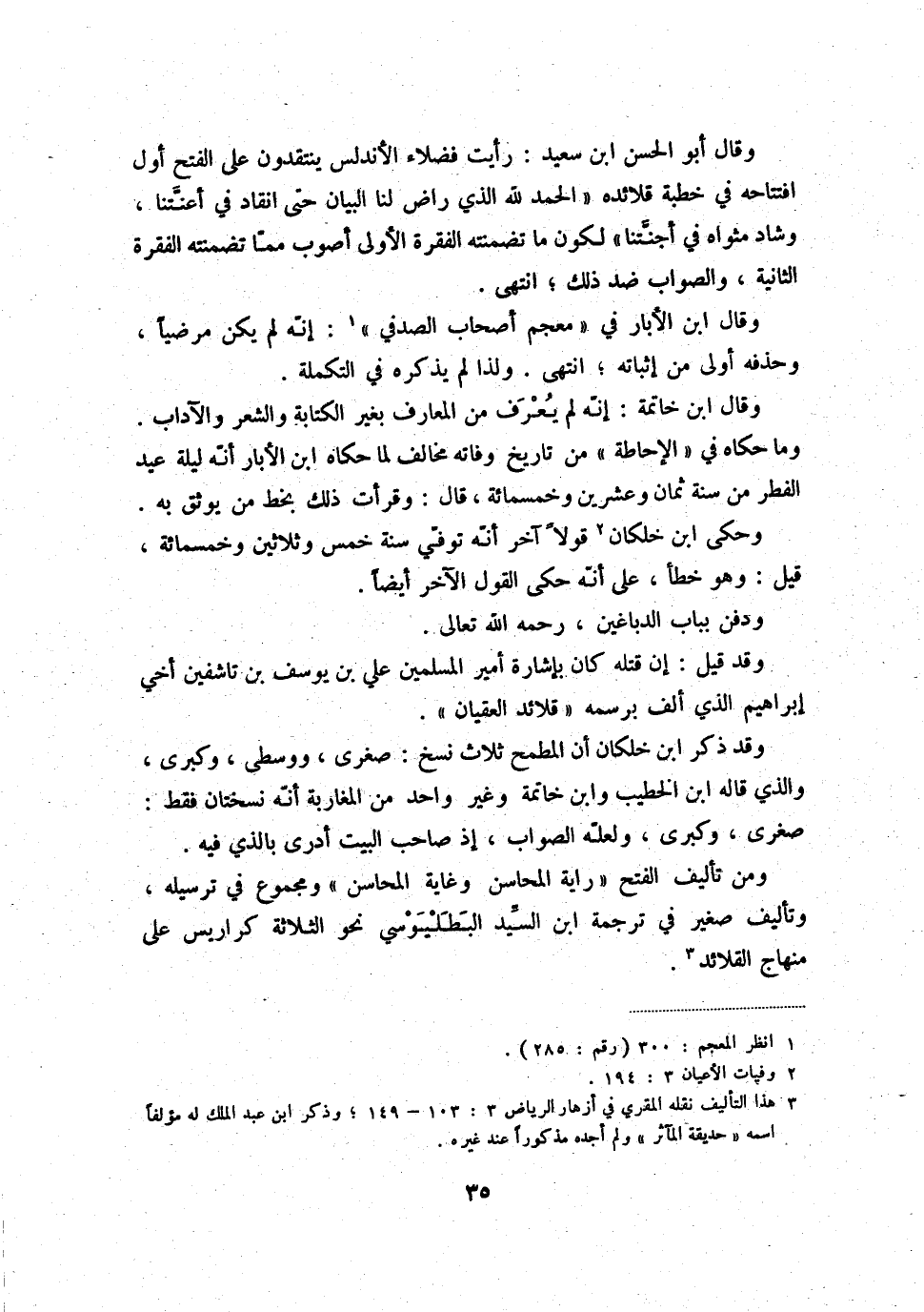 (3) هذا التأليف نقله المقري في أزهار الرياض 3: 103 - 149؛ وذكر ابن عبد الملك له مؤلفاً اسمه " حديقة المآثر " ولم أجده مذكوراً عند غيره.