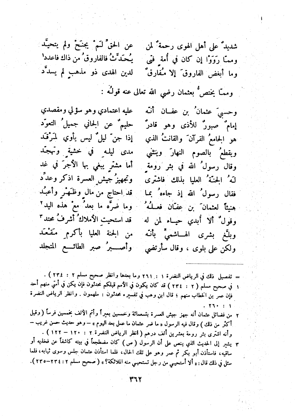 وما أبغض الفاروق إلا مفارق ... لدين الهدى ذو مذهب لم يسدّد وممّا يختص بعثمان رضي الله تعالى عنه قوله: