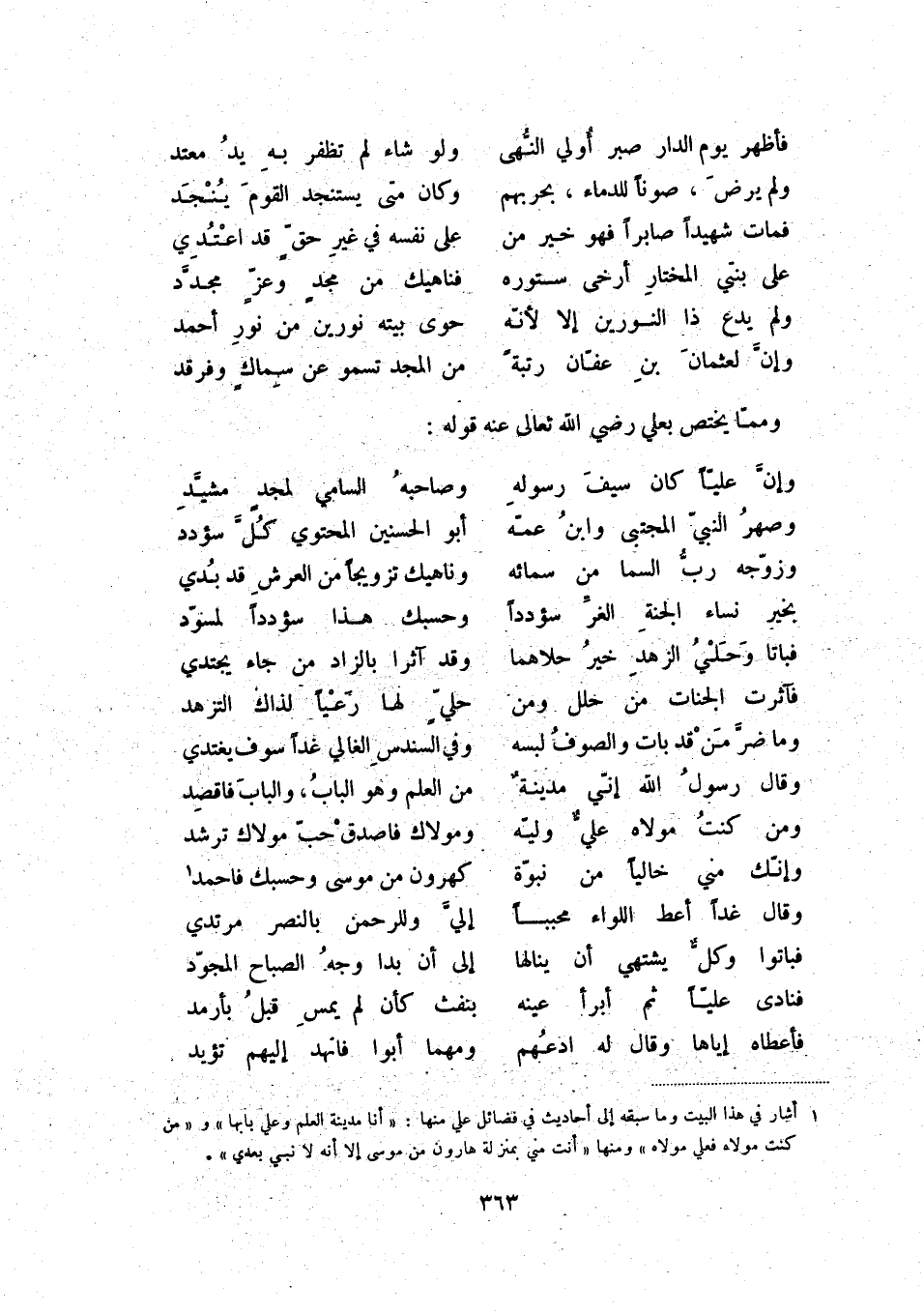 (1) اشار في هذا البيت وما سبقه إلى أحاديث في فضائل علي منها: " أنا مدينة العلم وعلي بابها " و " من كنت مولاه فعلي مولاه " ومنها " أنت مني بمنزلة هارون من موسى إلا أنه لا نبي بعدي ".