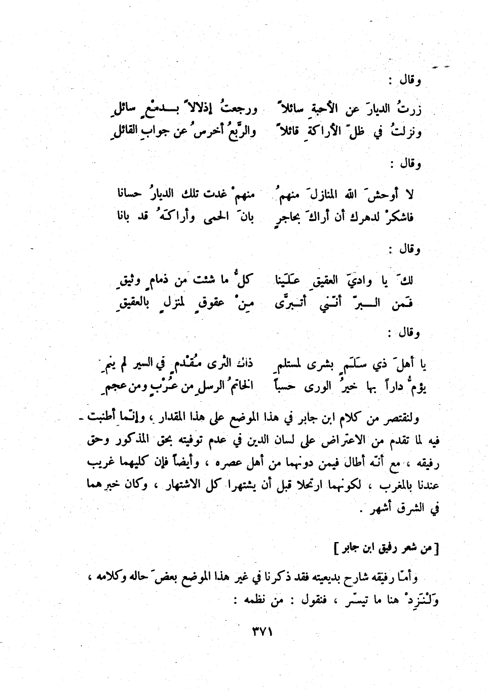 يؤم داراً بها خير الورى حسباً ... الخاتم الرسل من عرب ومن عجم ولنقتصر من كلام ابن جابر في هذا الموضع على هذا المقدار، وإنّما أطنبت فيه لما تقدم من الاعتراض على لسان الدين في عدم توفيته بحق المذكور وحق رفيقه، مع أنّه أطال فيمن دونهما من أهل عصره، وأيضاً فإن كليهما غريب عندنا بالمغرب، لكونهما ارتحلا قبل أن يشتهرا كل الاشتهار، وكان خبرهما في الشرق أشهر.