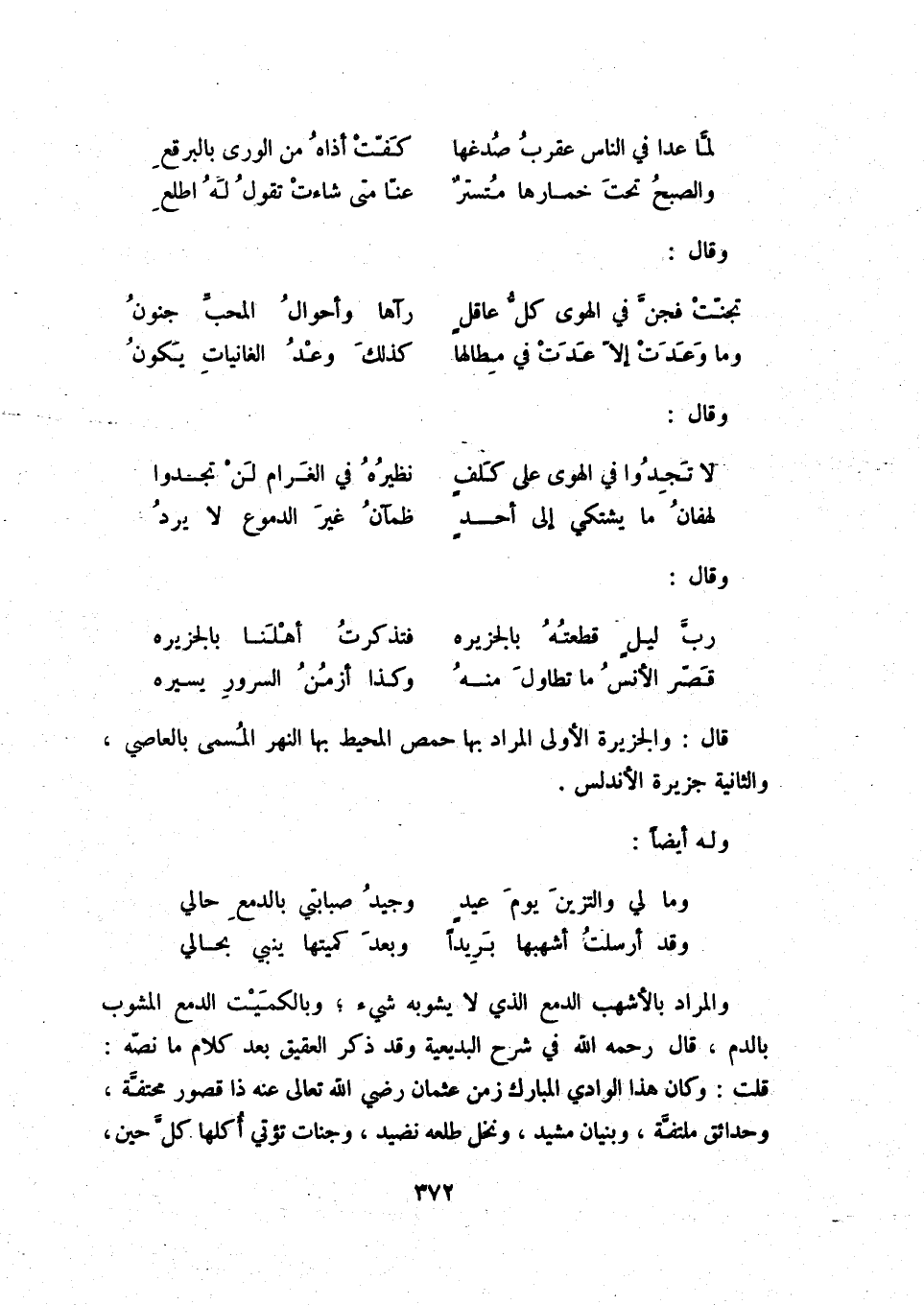 قصّر الأنس ما تطاول منه ... وكذا أزمن السرور يسيره قال: والجزيرة الأولى المراد بها حمص المحيط بها النهر المسمى بالعاصي، والثانية جزيرة الأندلس.