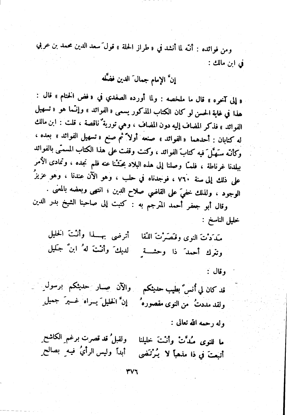 إنّ الإمام جمال الدين فضّله ... إلى آخره قال ما ملخصه: ولما أورده الصفدي في فض الختام قال: هذا في غاية الحسن لو كان الكتاب المذكور يسمى الفوائد وإنّما هو تسهيل الفوائد فذكر المضاف إليه دون المضاف، وهي تورية ناقصة، قلت: ابن مالك له كتابان: أحدهما الفوائد صنعه أولاً ثم صنع تسهيل الفوائد بعده، وكأنّه سهّل فيه كتاب الفوائد، وكنت وقفت على هذا الكتاب المسمّى بالفوائد ببلدنا غرناطة، فلمّا وصلنا إلى هذه البلاد بحثنا عنه فلم نجده، وتمادى الأمر على ذلك إلى سنة 760، فوجدناه في حلب، وهو الآن عندنا، وهو عزيز الوجود، ولذلك خفي على القاضي صلاح الدين؛ انتهى وبعضه بالمعنى.