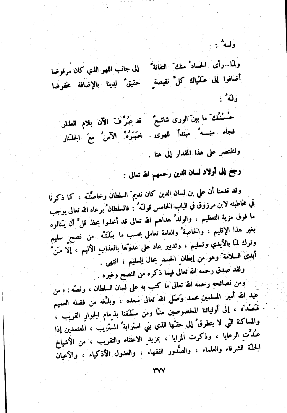 وقد قدمنا أن علي بن لسان الدين كان نديم السلطان وخاصّته، كما ذكرنا في مخاطبته لابن مرزوق في الباب الخامس قوله: فالسلطان يرعاه الله تعالى يوجب ما فوق مزية التعظيم، والولد هداهم الله تعالى قد أخذوا بحظ قلّ أن ينالوه بغير هذا الإقليم، والخاصة والعامة تعامل بحسب ما بلته من نصح سليم وترك لما بالأيدي وتسليم، وتدبير عاد على عدوّها بالعذاب الأليم، إلا من أبدى السلامة وهو من إبطان الحسد بحال السليم؛ انتهى.