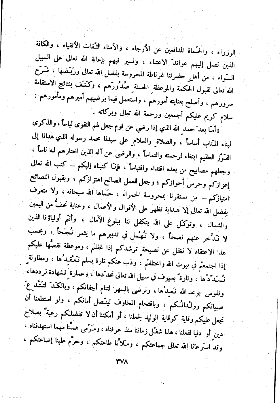 أمّا بعد حمد الله الذي إذا رضي عن قوم جعل لهم التوقى لباساً، والذكرى لبناء المتاب أساساً، والصلاة والسلام على سيدنا محمد رسوله الذي هدانا إلى الفوز العظيم ابتغاء لرحمته والتماساً، والرضى عن آله الذين اختارهم له ناساً، وجعلهم مصابيح من بعده اقتداء واقتباساً، فإنّا كتبناه إليكم - كتب الله تعالى إعزازكم وحرس أحوازكم؛ وجعل للعمل الصالح اهتزازكم؛ وبقبول النصائح امتيازكم - من مستقرنا بمحروسة الحمراء، حماها الله سبحانه، ولا متعرف بفضل الله تعالى إلا هداية تظهر على الأقوال والأعمال، وعناية تحفّ من اليمين والشمال، وتوكّل على الله يتكفل لنا ببلوغ الآمال، وأنتم أولياؤنا الذين لا ندّخر عنهم نصحاً، ولا نهمل في تدبيرهم ما يثمر نجحاً، وبحسب هذا الاعتقاد لا نغفل عن نصيحة ترشدكم إذا غفلتم، وموعظة نقصّها عليكم إذا اجتمعتم في بيوت الله واختلفتم، وذب عنكم تارة بسلم نعقدها، ومطاولة نسدّدها، وتارة بسيوف في سبيل الله تعالى نحدّدها، وعمارة للشهادة نرددها، ونفوس بوعد الله نعدها، ونرضى بالسهر لتنام أجفانكم، وبالكدّ لتّتّدع صبيانكم وولدانكم، وباقتحام المخاوف ليتّصل أمانكم، ولو استطعنا أن نجعل عليكم وقاية كوقاية الوليد لجعلنا، أو أمكننا أن لا تفضلكم رعية بصلاح دين أو دنيا لفعلنا، هذا شغل زماننا منذ عرفناه، ومرمى همّنا مهما استهدفناه، وقد استرعانا الله تعالى جماعتكم، وملاّنا طاعتكم، وحرّم علينا إضاعتكم