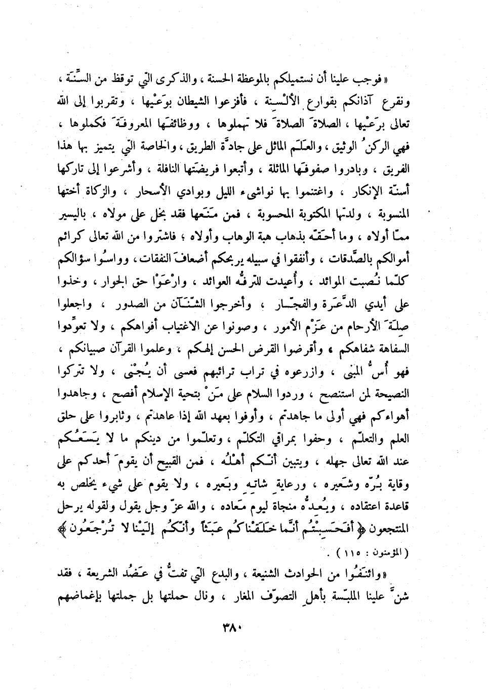 فوجب علينا أن نستميلكم بالموعظة الحسنة، والذكرى التي توقظ من السّنة، ونقرع آذانكم بقوارع الألسنة، فأفزعوا الشيطان بوعيها، وتقربوا إلى الله تعالى برعيها، الصلاة الصلاة فلا تهملوها، ووظائفها المعروفة فكملوها، فهي الركن الوثيق، والعلم الماثل على جادة الطريق، والخاصة التي يتميز بها هذا الفريق، وبادروا صفوفها الماثلة، وأتبعوا فريضتها النافلة، وأشرعوا إلى تاركها أسنّة الإنكار، واغتنموا بها نواشىء الليل وبوادي الأسحار، والزكاة أختها المنسوبة، ولدتها المكتوبة المحسوبة، فمن منعها فقد بخل على مولاه، باليسير ممّا أولاه، وما أحقّه بذهاب هبة الوهاب وأولاه؛ فاشتروا من الله تعالى كرائم أموالكم بالصّدقات، وأنفقوا في سبيله بربحكم أضعاف النفقات، ووسوا سؤالكم كلّما نصبت الموائد، وأعيدت للترفّه العوائد، وارعوا حق الجوار، وخذوا على أيدي الدّعرة والفجّار، وأخرجوا الشّنآن من الصدور، واجعلوا صلة الأرحام من عزم الأمور، وصونوا عن الاغتياب أفواهكم، ولا تعوّدوا السفاهة شفاهكم، وأقرضوا القرض الحسن إلهكم، وعلموا القرآن صبيانكم، فهو أسّ المبنى، وازرعوه في تراب ترائبهم فعسى أن يجنى، ولا تتركوا النصيحة لمن استنصح، وردوا السلام على من بتحية الإسلام أفصح، وجاهدوا أهواءكم فهي أولى ما جاهدتم، وأوفوا بعهد الله إذا عاهدتم، وثابروا على حلق العلم والتعلّم، وحفوا بمراقي التكلّم، وتعلّموا من دينكم ما لا يسعكم عند الله تعالى جهله، ويتبين أنّكم أهله، فمن القبيح أن يقوم أحدكم على وقاية برّه وشعيره، ورعاية شاته وبعيره، ولا يقوم على شيء يخلص به قاعدة اعتقاده، ويعدّه منجاة ليوم معاده، والله عزّ وجل يقول ولقوله يرحل المنتجعون " أفحسبتم أنّما خلقناكم عبثاً وأنّكم إلينا لا ترجعون " المؤمنون: 115.