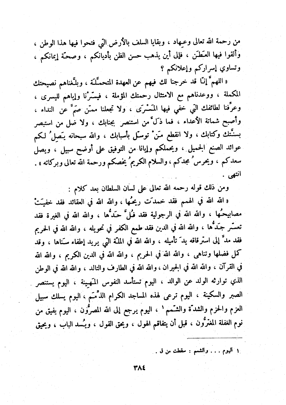 الله الله في الهمم فقد خمدت ريحها، والله الله في العقائد فقد خفيت مصابيحها، والله الله في الرجولية فقد فلّ حدّها، والله الله في الغيرة فقد تعسّر جدّها، والله الله في الدين فقد طمع الكفر في تحويله، والله الله في الحريم فقد مدّ إلى استرقاقه يد تأميله، والله الله في الملّة التي يريد إطفاء سناها، وقد كمل فضلها وتناهى، والله الله في الحريم، والله الله في الدين الكريم، والله الله في القرآن، والله الله في الجيران، والله الله في الطارف والتالد، والله الله في الوطن الذي توارثه الولد عن الوالد، اليوم تستأسد النفوس المهينة، اليوم يستنصر الصبر والسكينة، اليوم ترعى لهذه المساجد الكرام الّمم، اليوم يسلك سبيل العزم والحزم والشدّة والشّمم (1) ، اليوم يرجع إلى الله المصرّون، اليوم يفيق من نوم الغفلة المغترّون، قبل أن يتفاقم الهول، ويحق القول، ويسد الباب، ويحيق