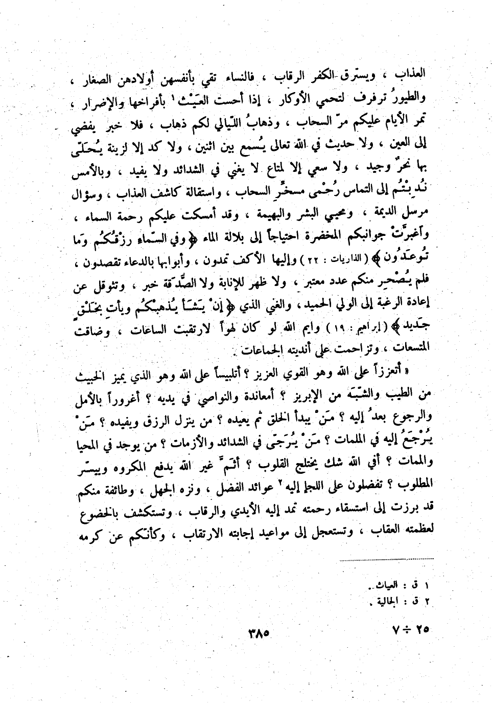 العذاب، ويسترق الكفر الرقاب، فالنساء تقي بأنفسهن أولادهن الصغار، والطيور ترفرف لتحمي الأوكار، إذا أحست العيث (1) بأفراخها والإضرار، تمر الأيام عليكم مرّ السحاب، وذهاب اللّيالي لكم ذهاب، فلا خبر يفضي إلى العين، ولا حديث في الله تعالى يسمع بين اثنين، ولا كد إلا لزينة يحلّى بها نحر وجيد، ولا سعي إلا لمتاع لا يغني في الشدائد ولا يفيد، وبالأمس ندبتم إلى التماس رحمى مسخّر السحاب، واستقالة كاشف العذاب، وسؤال مرسل الديمة، ومحيي البشر والبهيمة، وقد أمسكت عليكم رحمة السماء، واغبرّت جوانبكم المخضرة احتياجاً إلى بلالة الماء " وفي السّماء رزقكم وما توعدون " الذاريات: 22 وإليها الأكف تمدون، وأبوابها بالدعاء تقصدون، فلم يصحر منكم عدد معتبر، ولا ظهر للإنابة ولا الصّدقة خبر، وتثوقل عن إعادة الرغبة إلى الولي الحميد، والغني الذي " إن يشأ يذهبكم ويأت بخلق جديد " إبراهيم: 19 وايم الله لو كان لهواً لارتقبت الساعات، وضاقت المتسعات، وتزاحمت على أنديته الجماعات.