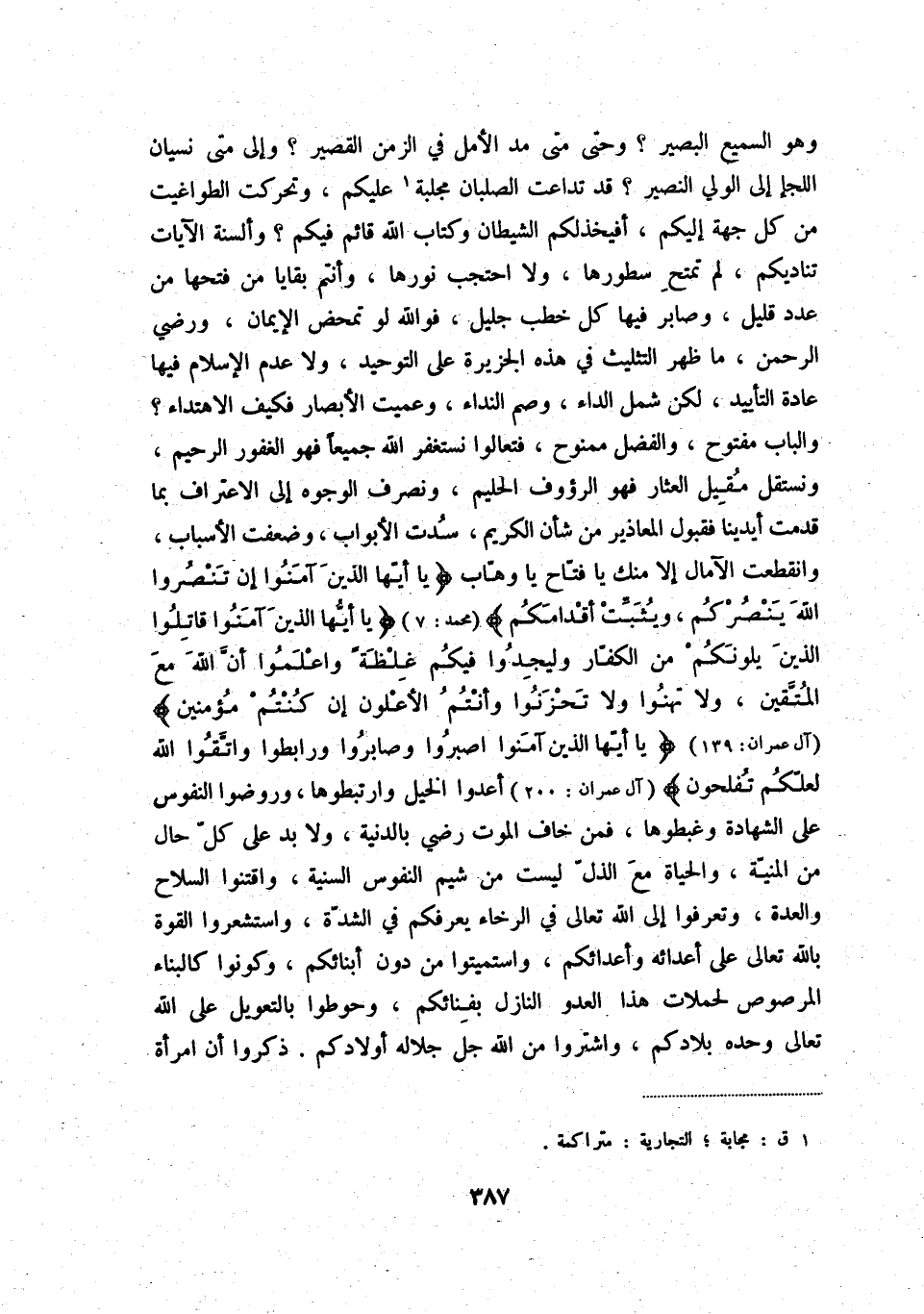 وهو السميع البصير وحتى متى مد الأمل في الزمن القصير وإلى متى نسيان اللجإ إلى الولي النصير قد تداعت الصلبان مجلبة (1) عليكم، وتحركت الطواغيت من كل جهة إليكم، أفيخلكم الشيطان وكتاب الله قائم فيكم وألسنة الآيات تناديكم، لم تمتح سطورها، ولا احتجب نورها، وأنتم بقايا من فتحها من عدد قليل، وصابر فيها كل خطب جليل، فوالله لو تمحض الإيمان، ورضي الرحمن، ما ظهر التثليث في هذه الجزيرة على التوحيد، ولا عدم الإسلام فيها عادة التأييد، لكن شمل الداء، وصم النداء، وعميت الأبصار فكيف الاهتداء والباب مفتوح، والفضل ممنوح، فتعالوا نستغفر الله جميعاً فهو الغفور الرحيم، ونستقل مقيل العثار فهو الرؤوف الحليم، ونصرف الوجوه إلى الاعتراف بما قدمت أيدينا فقبول المعاذير من شأن الكريم، سدت الأبواب، وضعفت الأسباب، وانقطعت الآمال إلا منك يا فتّاح يا وهّاب " يا أيّها الذين آمنوا إن تنصروا الله ينصركم، ويثبّت أقدامكم " محمد: 7 " يا أيّها الذين آمنوا قاتلوا الذين يلونكم من الكفّار وليجدوا فيكم غلظةً والعموا أنّ الله مع المتّقين، ولا تهنوا ولا تحزنوا وأنتم الأعلون إن كنتم مؤمنين " آل عمران: 139 " يا أيّها الذين آمنوا اصبروا وصابروا ورابطوا واتّقوا الله لعلّكم تفلحون " آل عمران: 200 أعدوا الخيل وارتبطوها، وروضوا النفوس على الشهادة وغبطوها، فمن خاف الموت رضي بالدنية، ولا بد على كلّ حال من المنيّة، والحياة مع الذلّ ليست من شيم النفوس السنية، واقتنوا السلاح والعدة، وتعرفوا إلى الله تعالى في الرخاء يعرفكم في الشدّة، واستشعروا القوة بالله تعالى على أعدائه وأعدائكم، واستميتوا من دون أبنائكم، وكونوا كالبناء المرصوص لحملات هذا العدو النازل بفنائكم، وحوطوا بالتعويل على الله تعالى وحده بلادكم، واشتروا من الله جل جلاله أولادكم. ذكروا أن امرأة