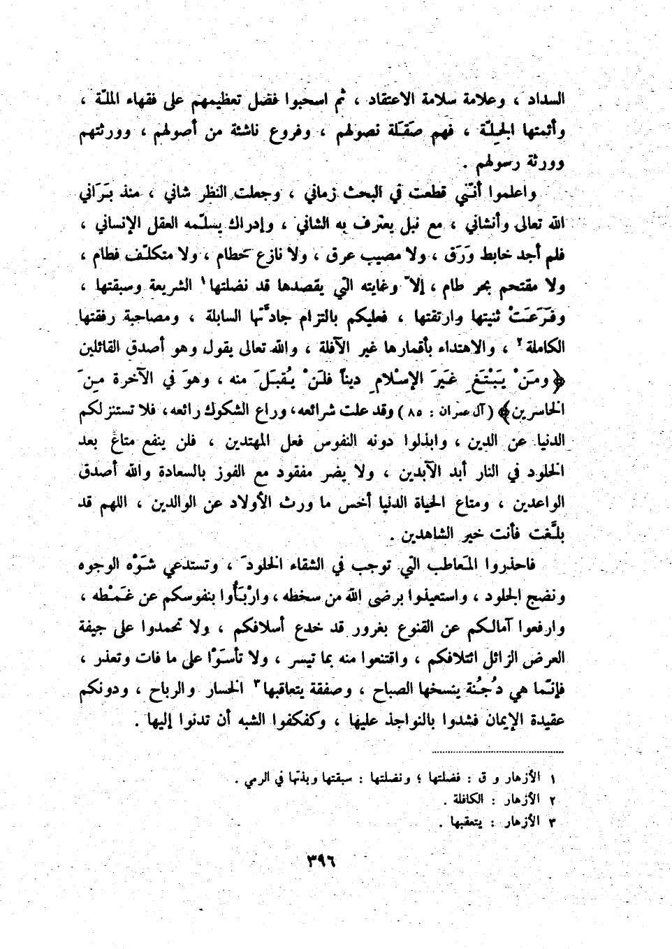 واعلموا أنّني قطعت في البحث زماني، وجعلت النظر شاني، منذ براني الله تعالى وأنشاني، مع نبل يعترف به الشاني، وإدراك يسلّمه العقل الإنساني، فلم أجد خابط ورق، ولا مصيب عرق، ولا نازع خطام، ولا متكلّف فطام، ولا مقتحم بحر طام، إلاّ وغايته التي يقصدها قد نضلتها (1) الشريعة وسبقتها، وفرعت ثنيتها وارتقتها، فعليكم بالتزام جادّتها السابلة، ومصاحبة رفقتها الكاملة (2) ، والاهتداء بأقمارها غير الآفلة، والله تعالى يقول وهو أصدق القائلين " ومن يبتغ غير الإسلام ديناً فلن يقبل منه، وهو في الآخرة من الخاسرين " آل عمران: 85 وقد علت شرائعه، وراع الشكوك رائعه، فلا تستنزلكم الدنيا عن الدين، وابذلوا دونه النفوس فعل المهتدين، فلن ينفع متاع بعد الخلود في النار أبد الآبدين، ولا يضر مفقود مع الفوز بالسعادة والله أصدق الواعدين، ومتاع الحياة الدنيا أخس ما ورث الأولاد عن الوالدين، اللهم قد بلّغت فأنت خير الشاهدين.