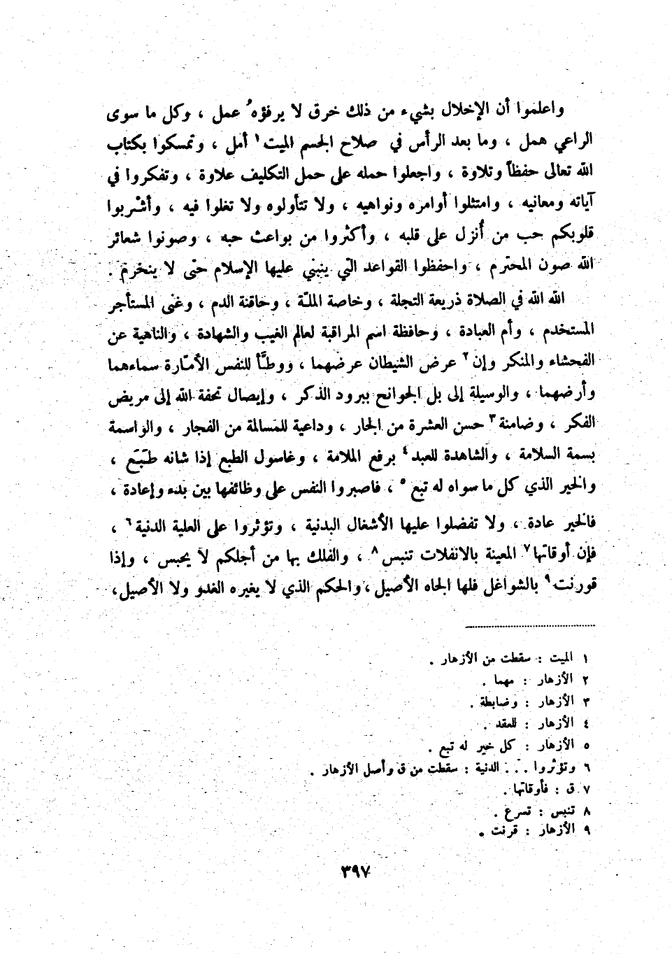 واعلموا أن الإخلال بشيء من ذلك خرق لا يرفؤه عمل، وكل ما سوى الراعي همل، وما بعد الرأس في صلاح الجسم الميت (1) أمل، وتمسكوا بكتاب الله تعالى حفظاً وتلاوة، واجعلوا حمله على حمل التكليف علاوة، وتفكروا في آياته ومعانيه، وامتثلوا أوامره ونواهيه، ولا تتأولوه ولا تغلوا فيه، وأشربوا قلوبكم حب من أنزل على قلبه، وأكثروا من بواعث حبه، وصونوا شعائر الله صون المحترم، واحفظوا القواعد التي ينبني عليها الإسلام حتى لا ينخرم.